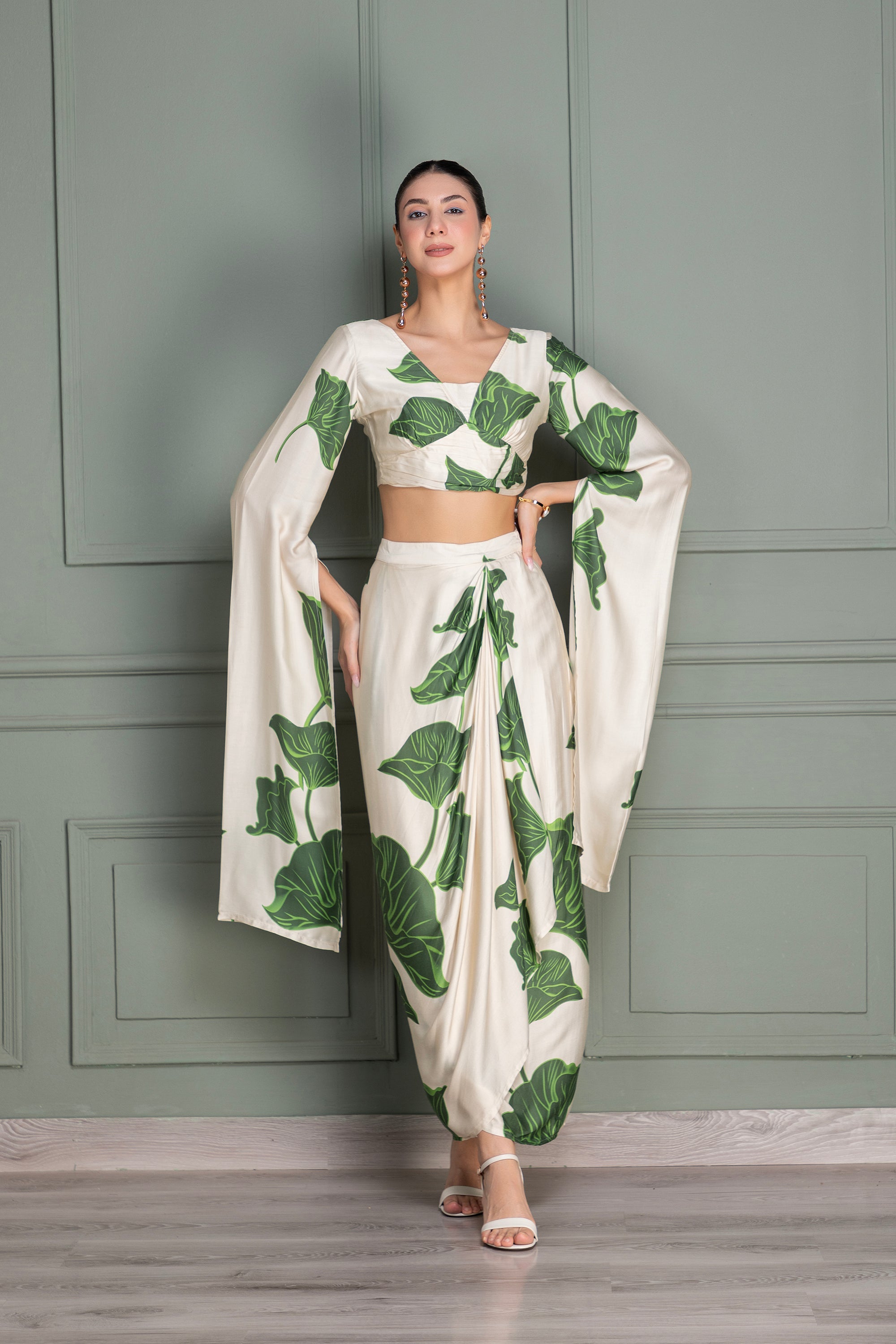 Beige and Green Floral Printed Drape Top and Dhoti Skirt Set