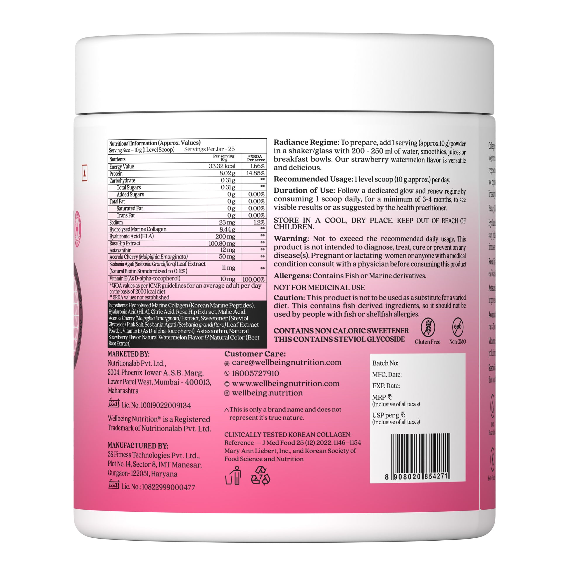Wellbeing Nutrition’s Beauty Collagen | Strawberry Watermelon Flavor is a scientifically formulated beauty supplement designed to support skin, hair, and nail health from within. Each serving provides 8000 mg of premium wild-caught marine collagen (Types I & III), selected for purity and performance.