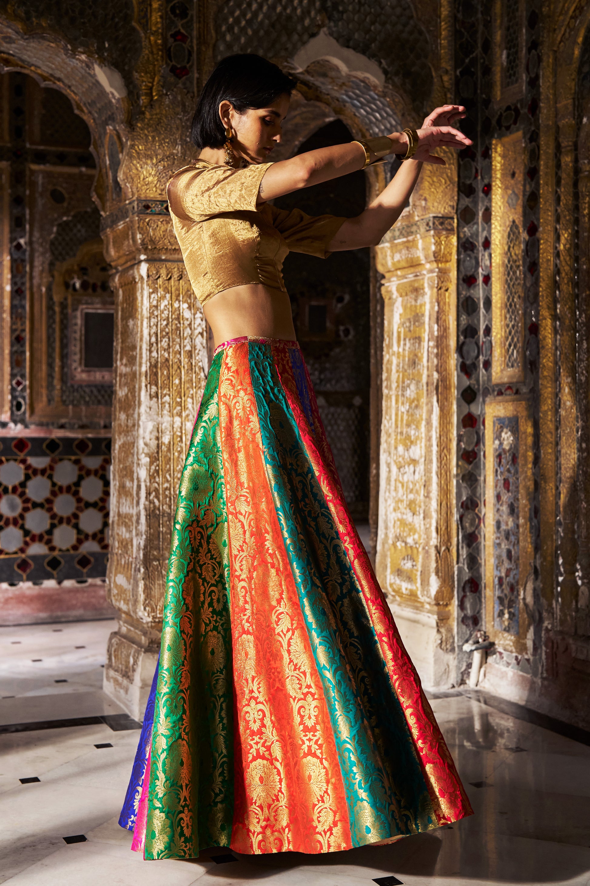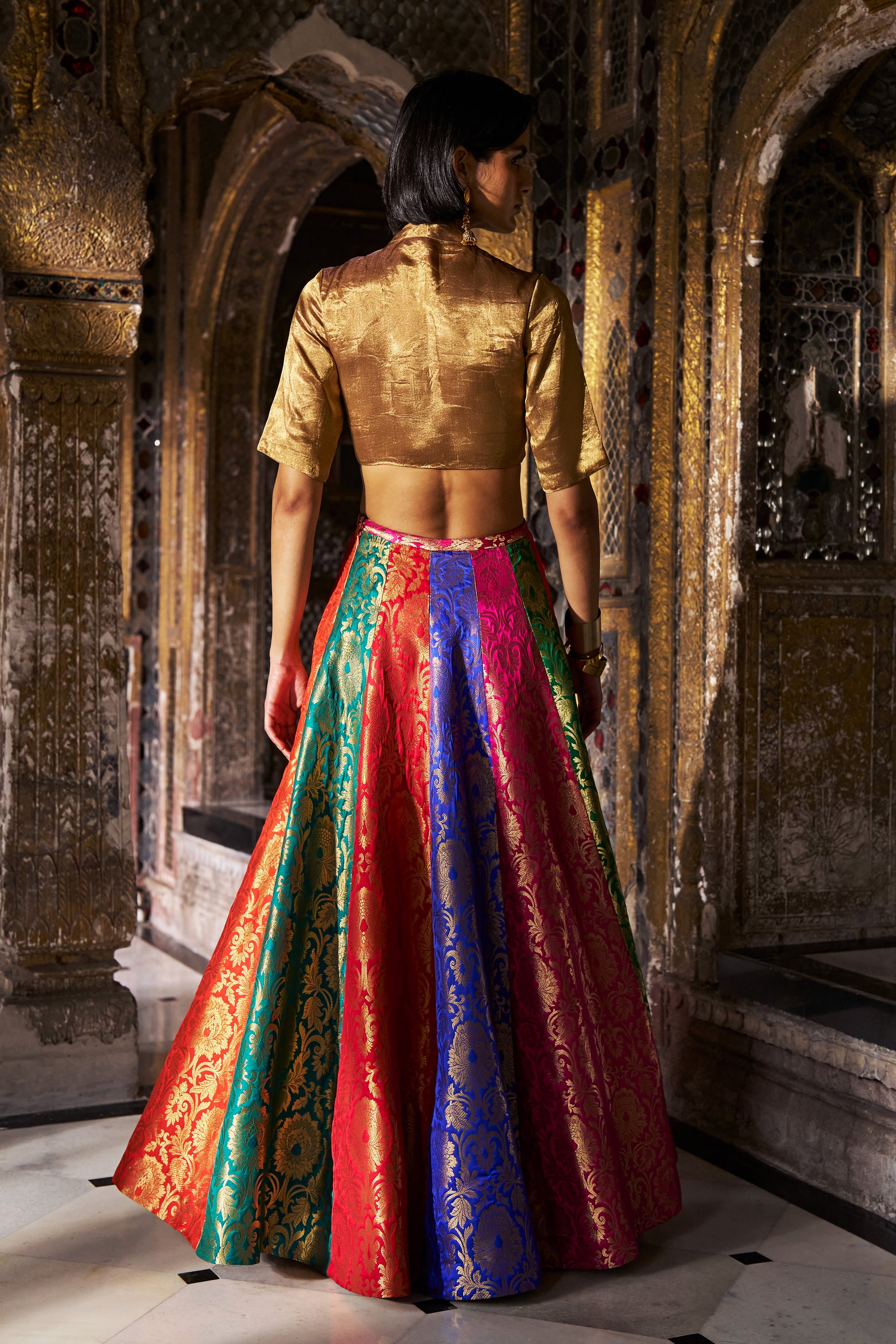 Cropped shirt in Benares tissue with short sleeves and a band collar. Golden zipper with tasseled puller front closure. Fully lined.
