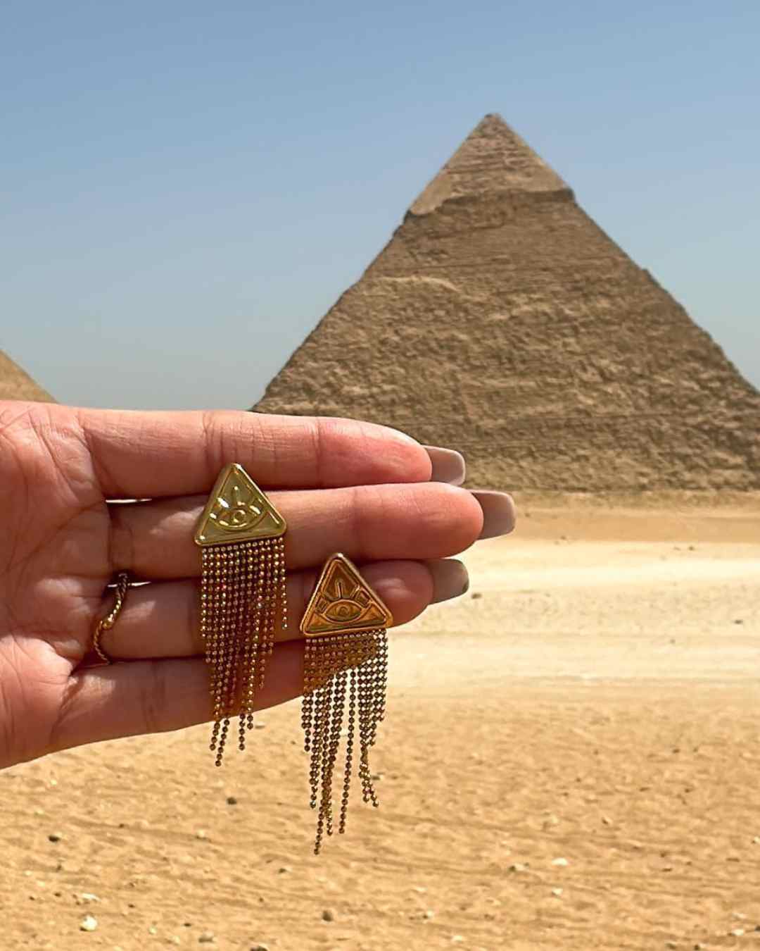 Cairo Earrings are the latest addition to our bold and unique collection. These yellow earrings are inspired by the iconic shape of pyramids, giving them their striking and timeless appeal. The textured tassels add a playful touch, creating a statement accessory that is both elegant and mysterious.