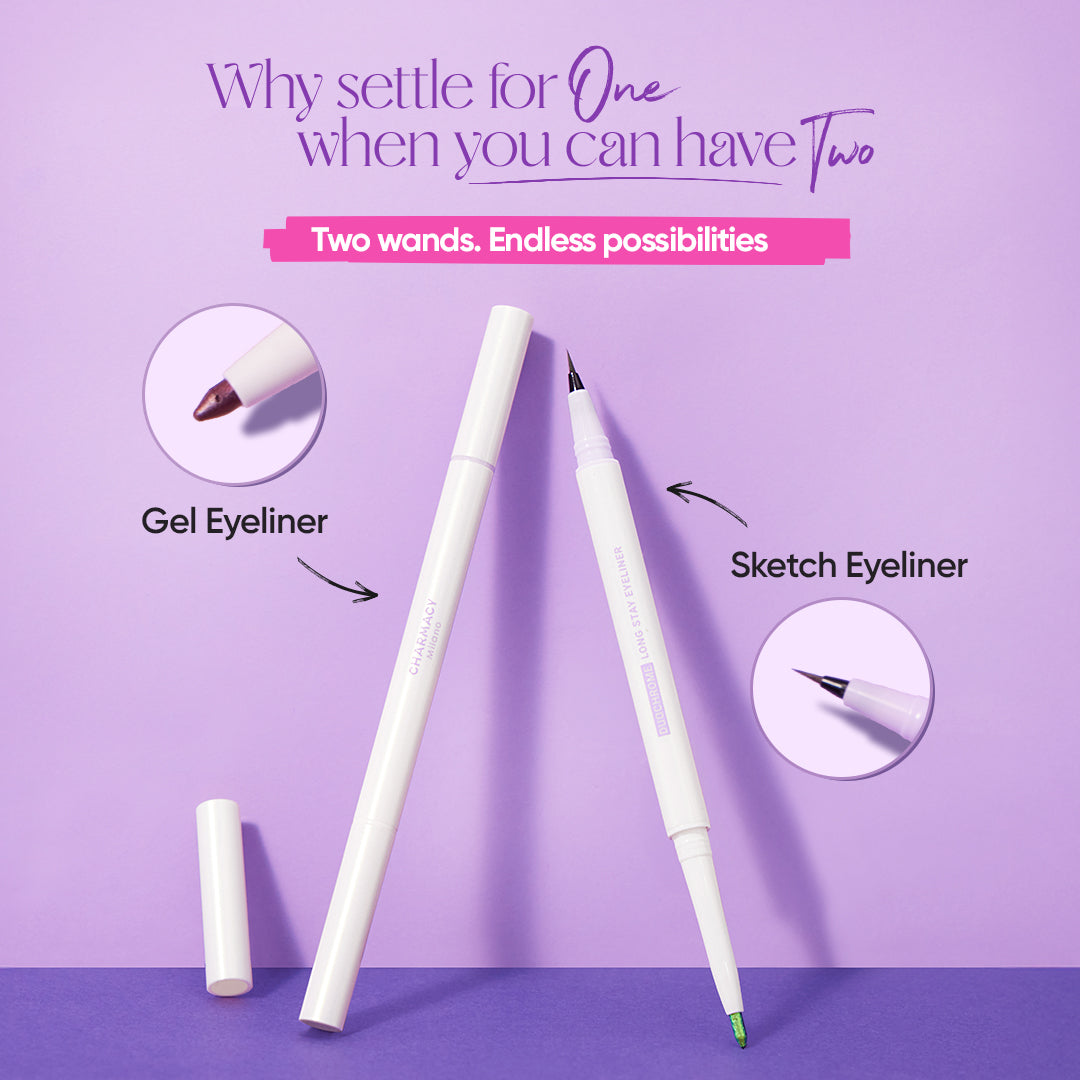 Charmacy Milano Duo Drama Multichromes & Metallics Eyeliner is designed to deliver high-impact, multidimensional eye looks through an innovative dual-ended format. One side features a liquid liner for precise definition, while the other offers a creamy gel liner that glides smoothly for bold, metallic or color-shifting effects.