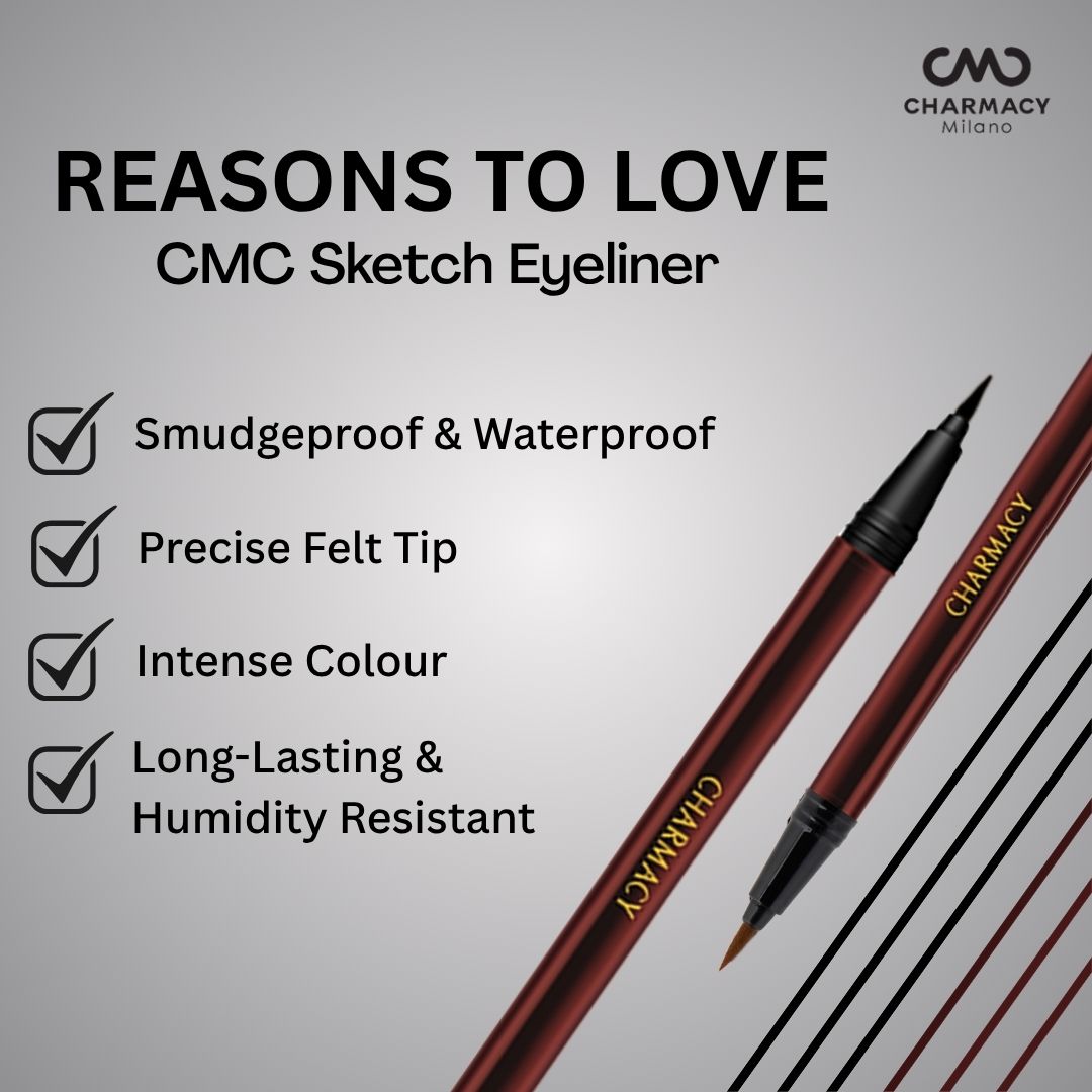 Charmacy Milano Sketch Eyeliner is designed to deliver precise, defined lines with ease. Featuring a smooth-gliding felt tip applicator, it allows for controlled strokes that help create classic wings or bold graphic looks effortlessly.