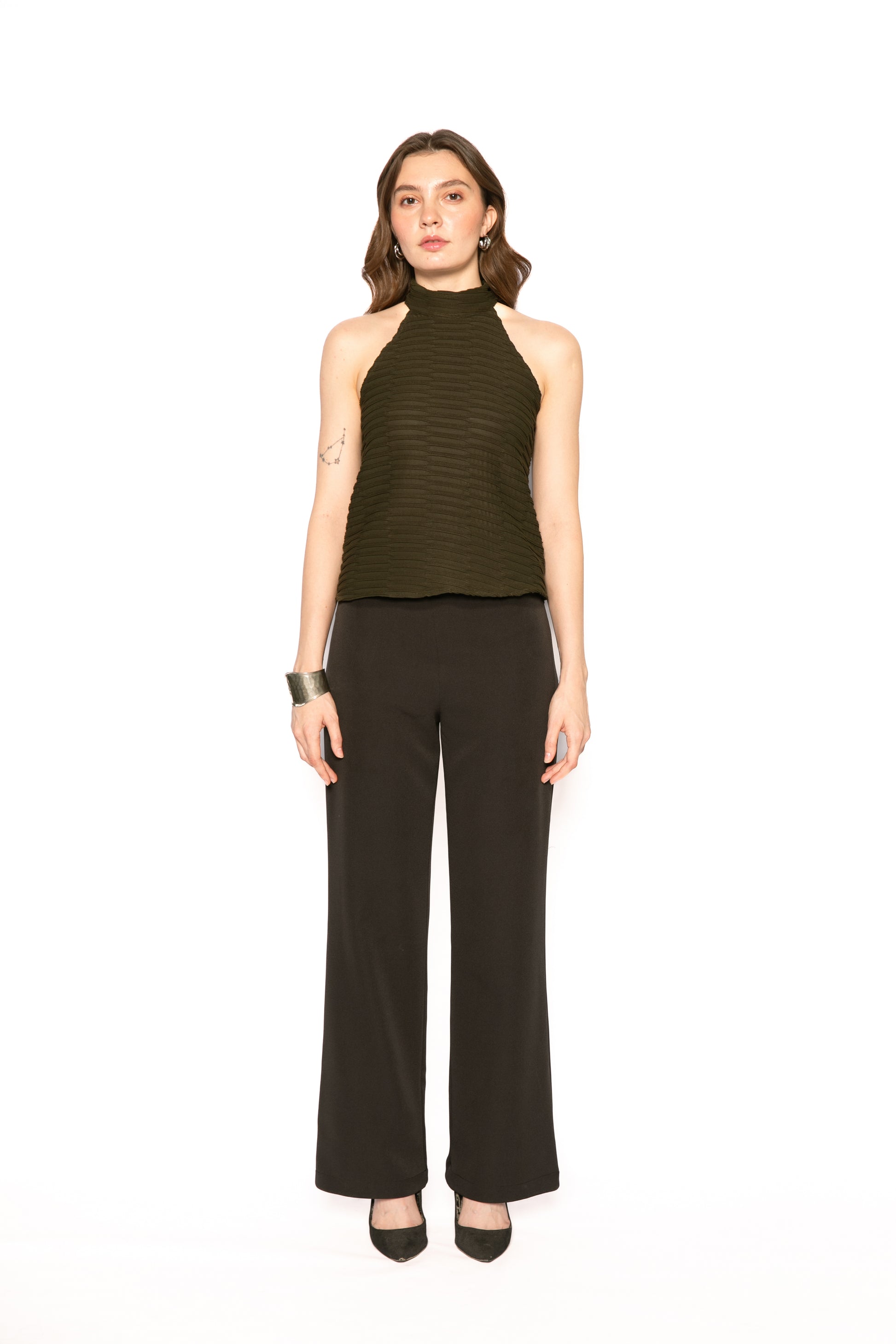 A sleeveless top with a halter neckline that secures with a two-button closure behind the neck, forming a keyhole opening. Features a structured silhouette.