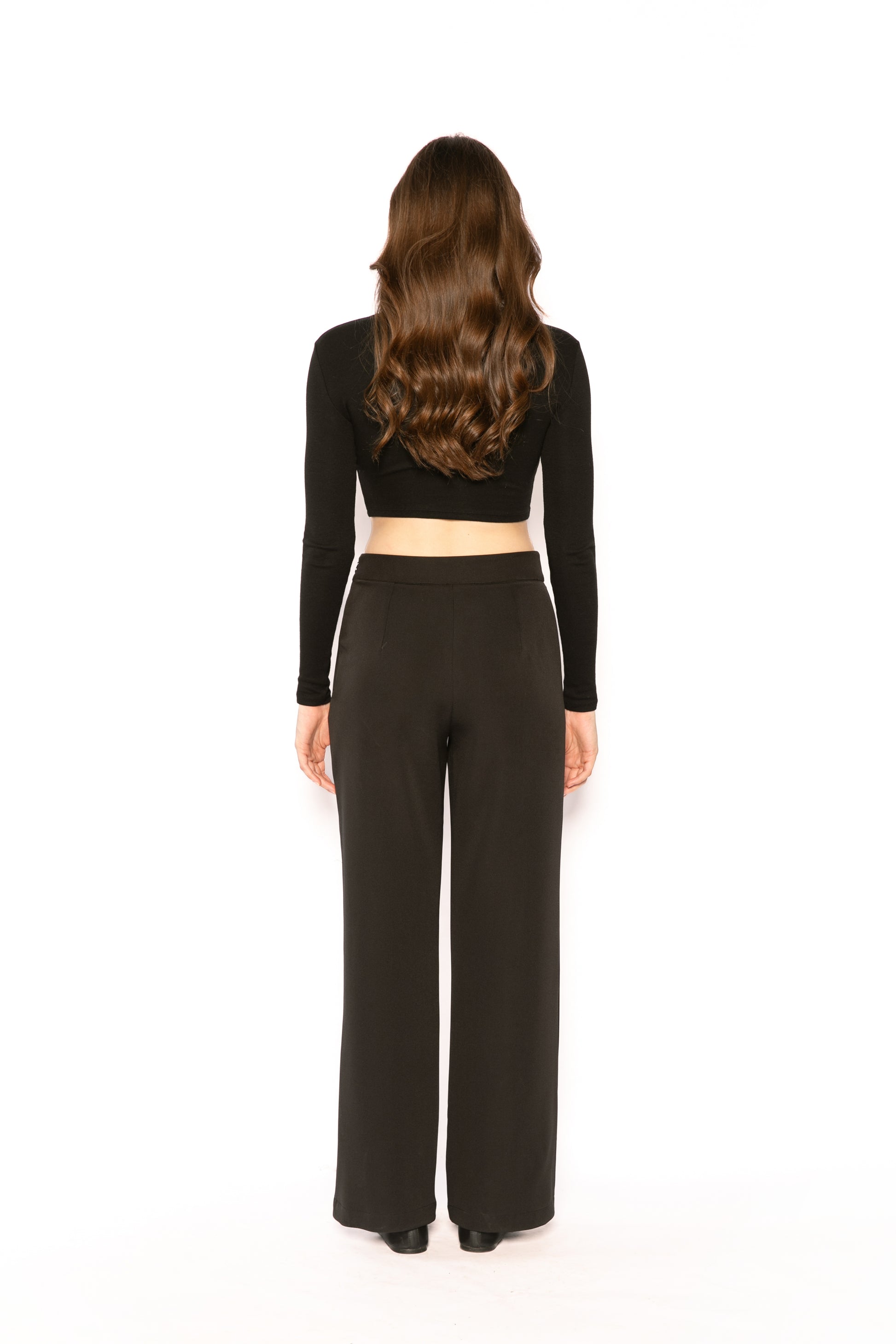 A pair of full-length straight trousers with a concealed zip closure at the side. Features a tailored, fitted waist, and a straight hem offering a sharp, professional look.