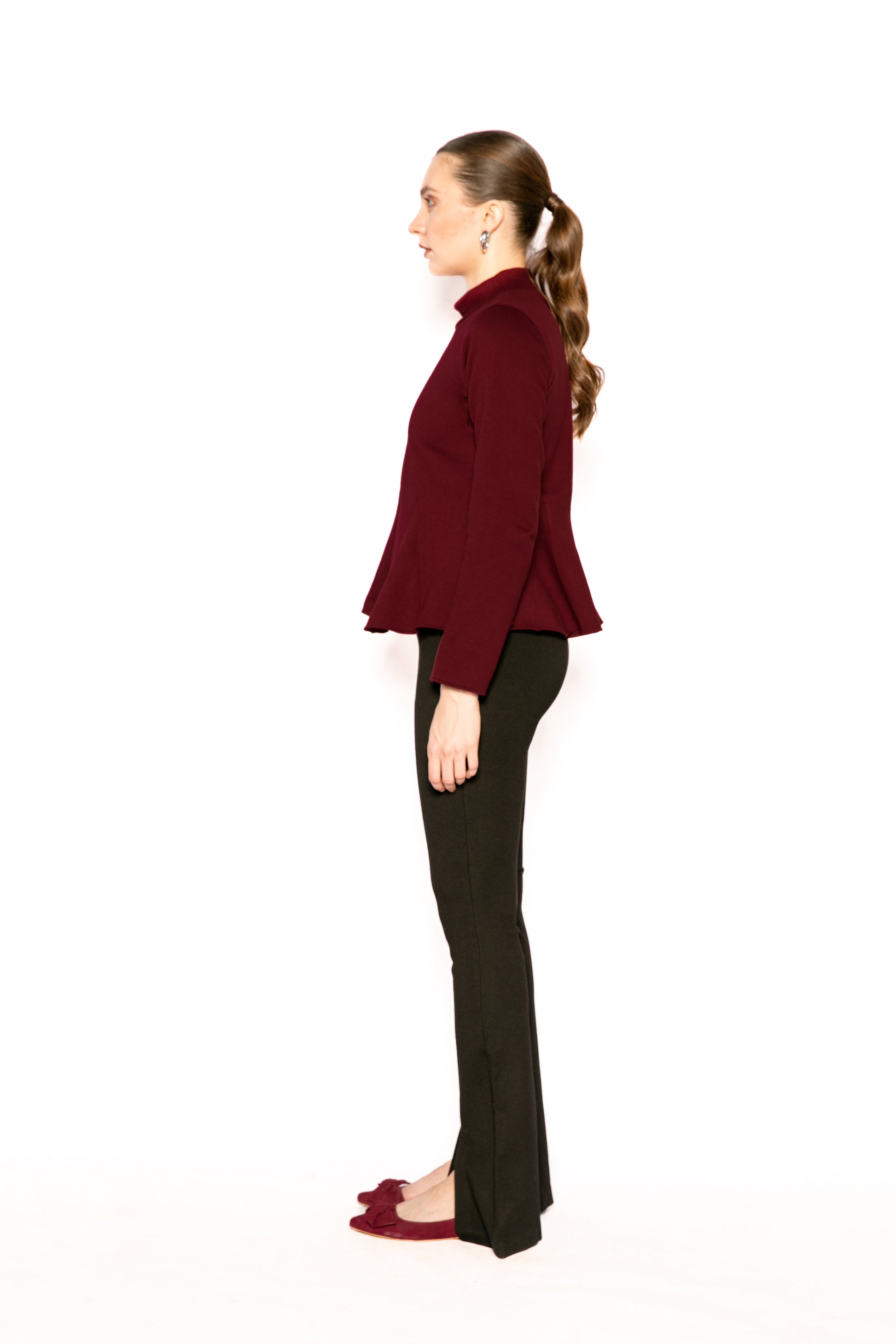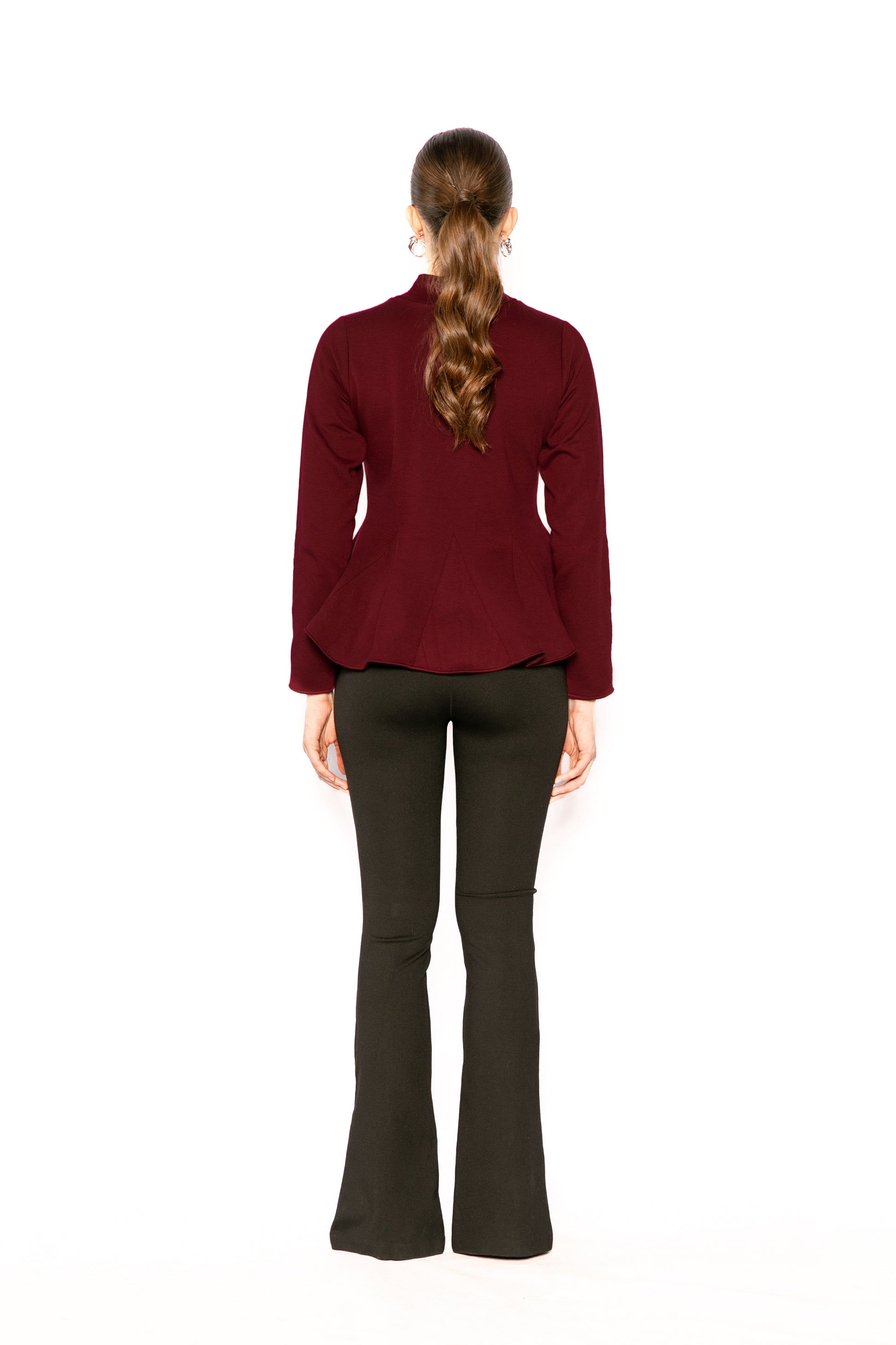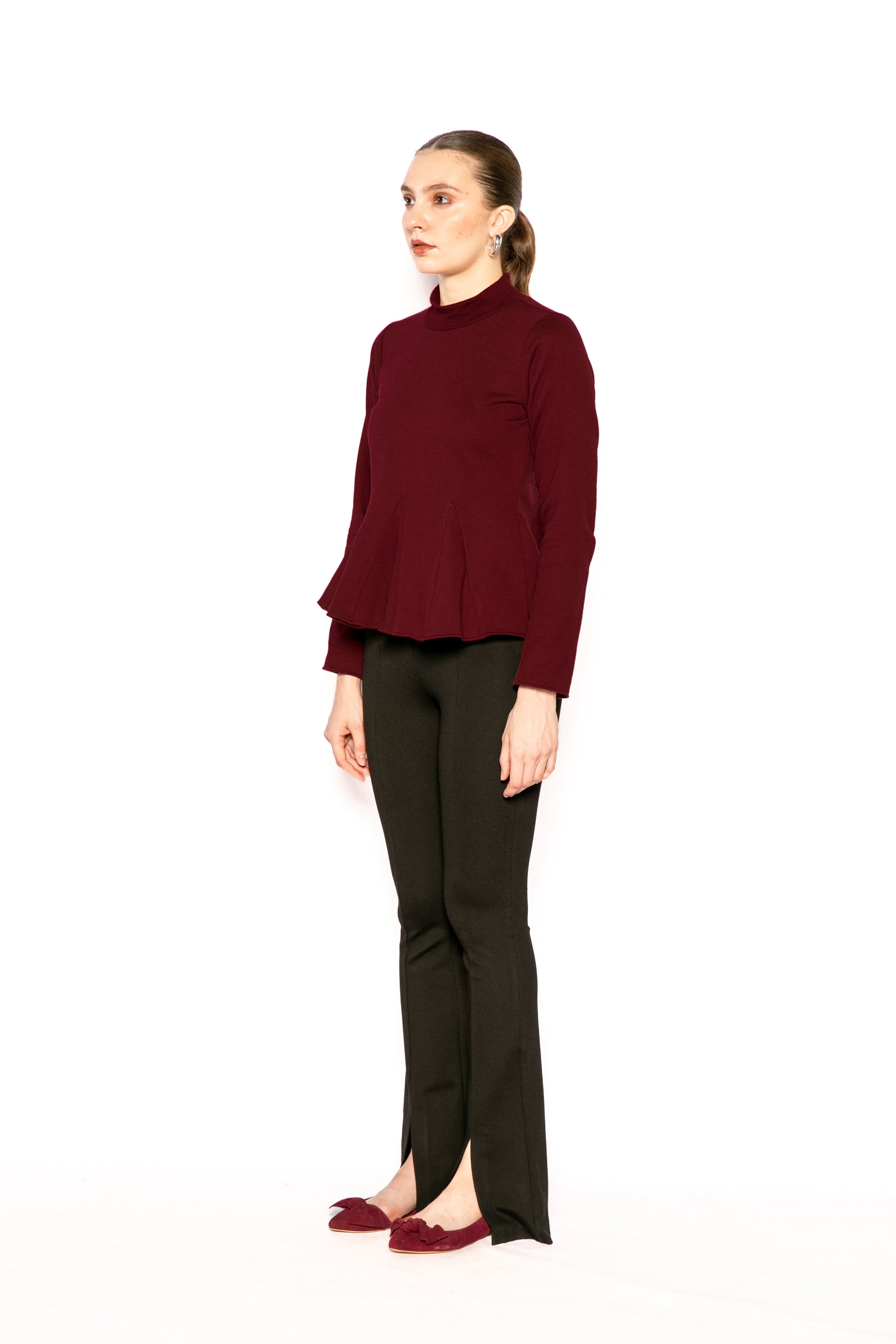 A long-sleeved top featuring a high mock neck with a rib finish. Features a slim fit with gored panels at the hem to create a flared peplum silhouette, and a slip-on closure, offering a highly structured and feminine fit.