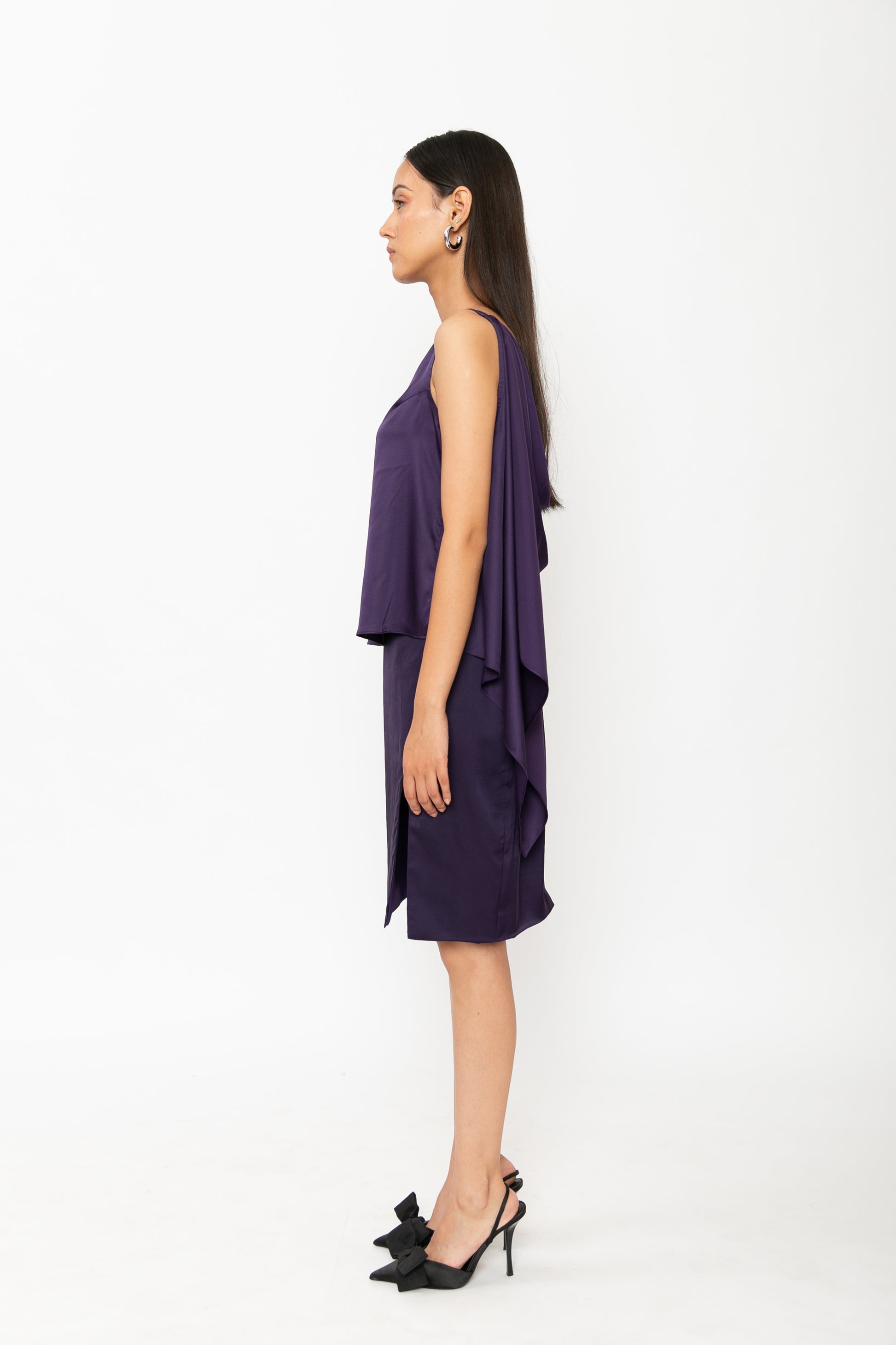 An elegant purple satin top with a clean, structured front and a dramatic draped cowl back with extended shoulder detailing. The asymmetric design blends modern minimalism with graceful movementperfect for a night out