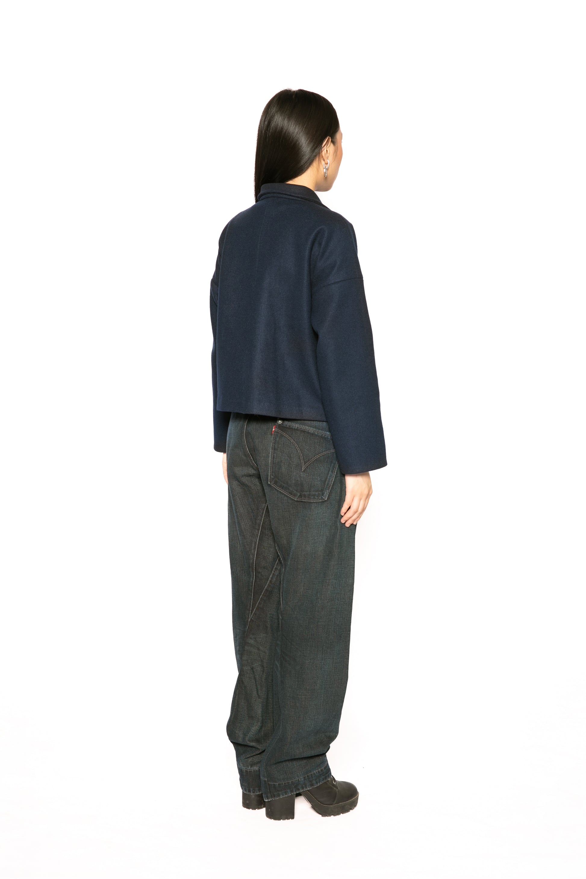 A long-sleeved cropped shacket with a basic collar and statement button closures at the front. Features a boxy fit, offering a relaxed and structured silhouette.