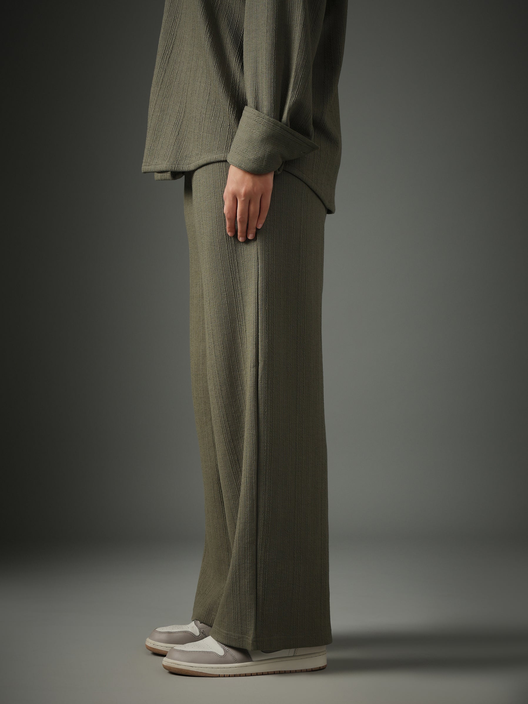 Relaxed-fit pants crafted from textured cross-knit cotton in a muted olive tone. Designed with an elastic waistband, adjustable drawstring, and straight-leg silhouette for a structured yet easy fit. Perfect for everyday wear or paired with the matching shirt for a coordinated look.