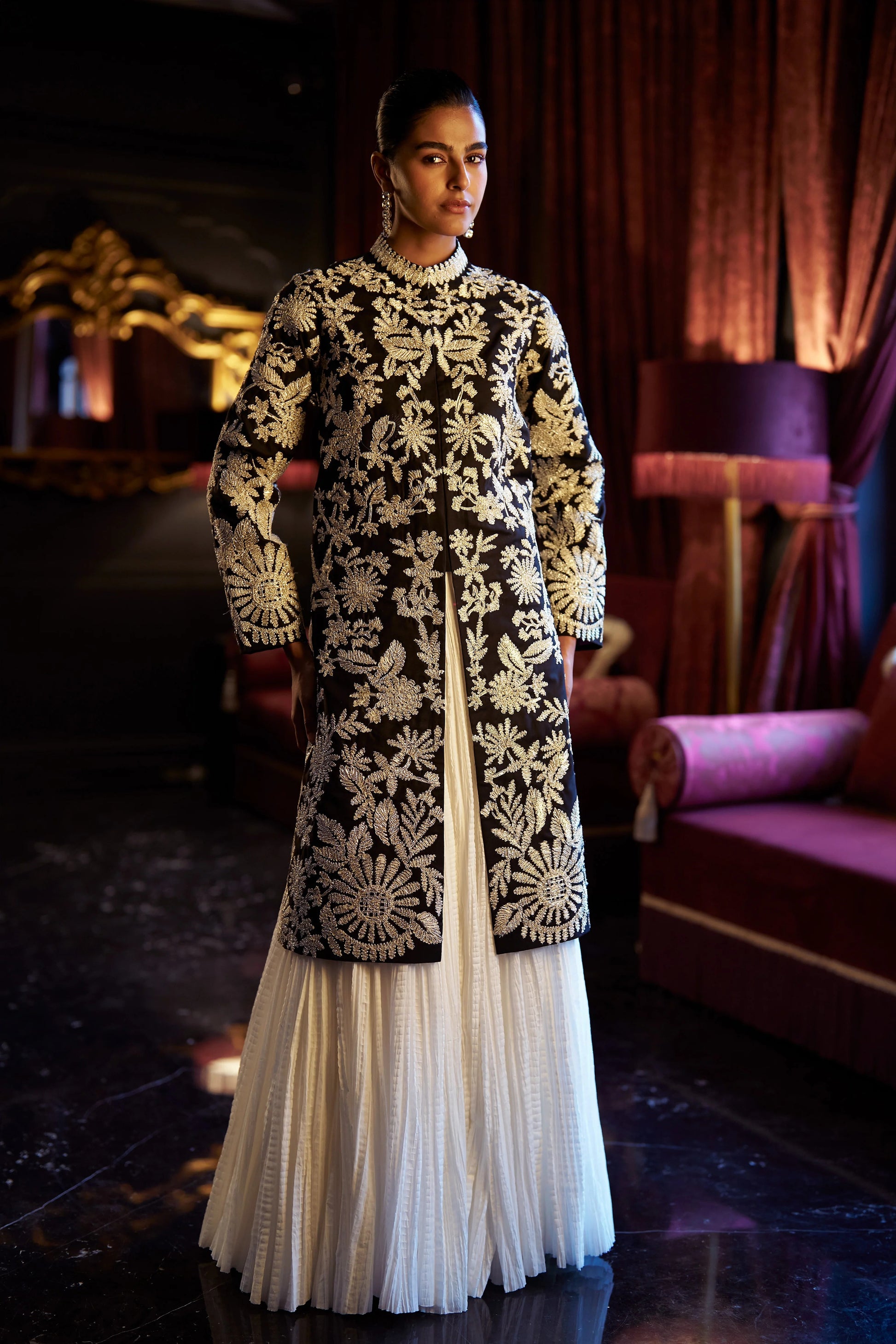 Hand-crushed textured maxi skirt with a crinkled finish. Flowy flare designed for dramatic movement. Elasticated waistband with side zip and hook/eye closure. Garment is fully lined.