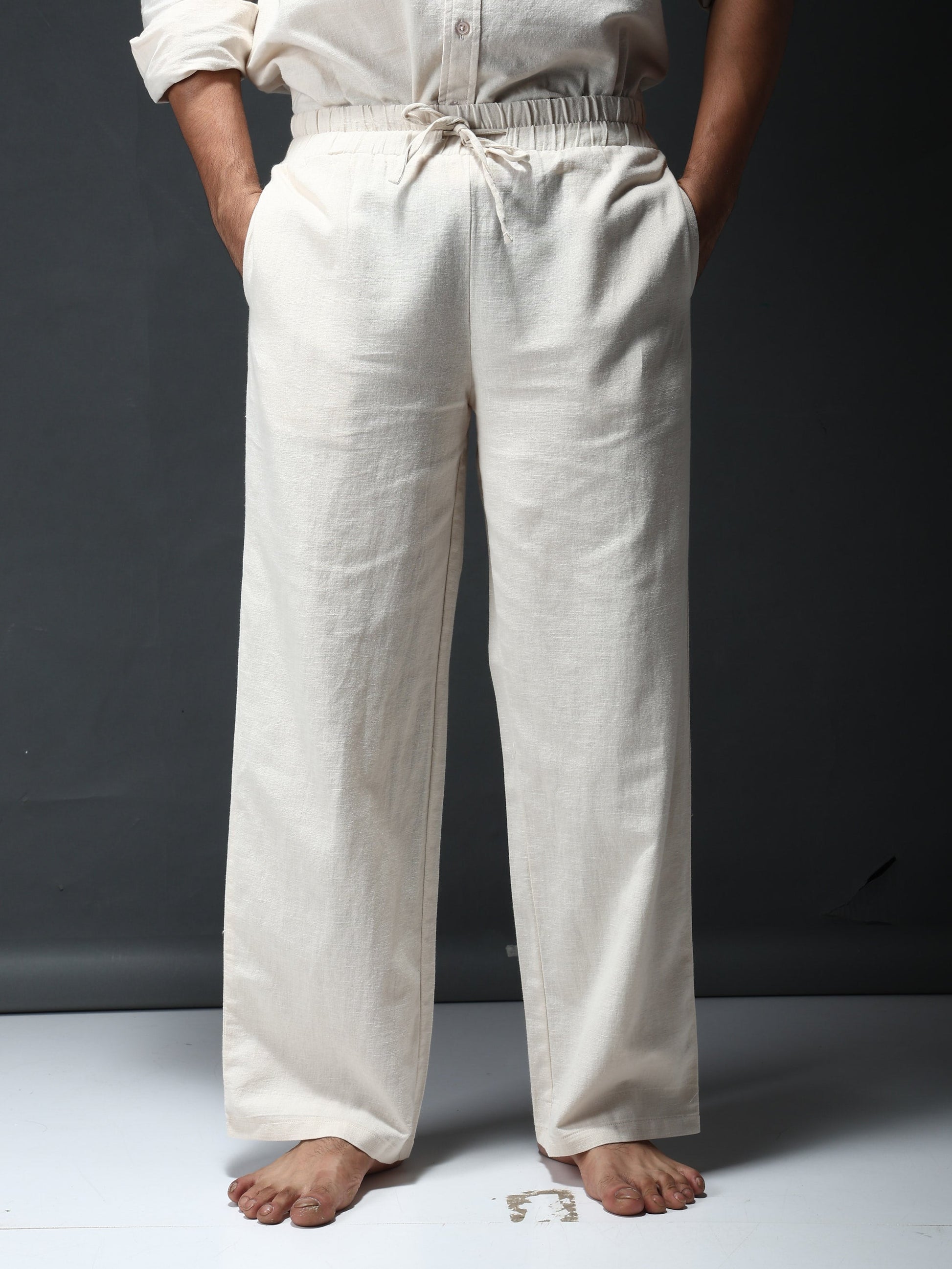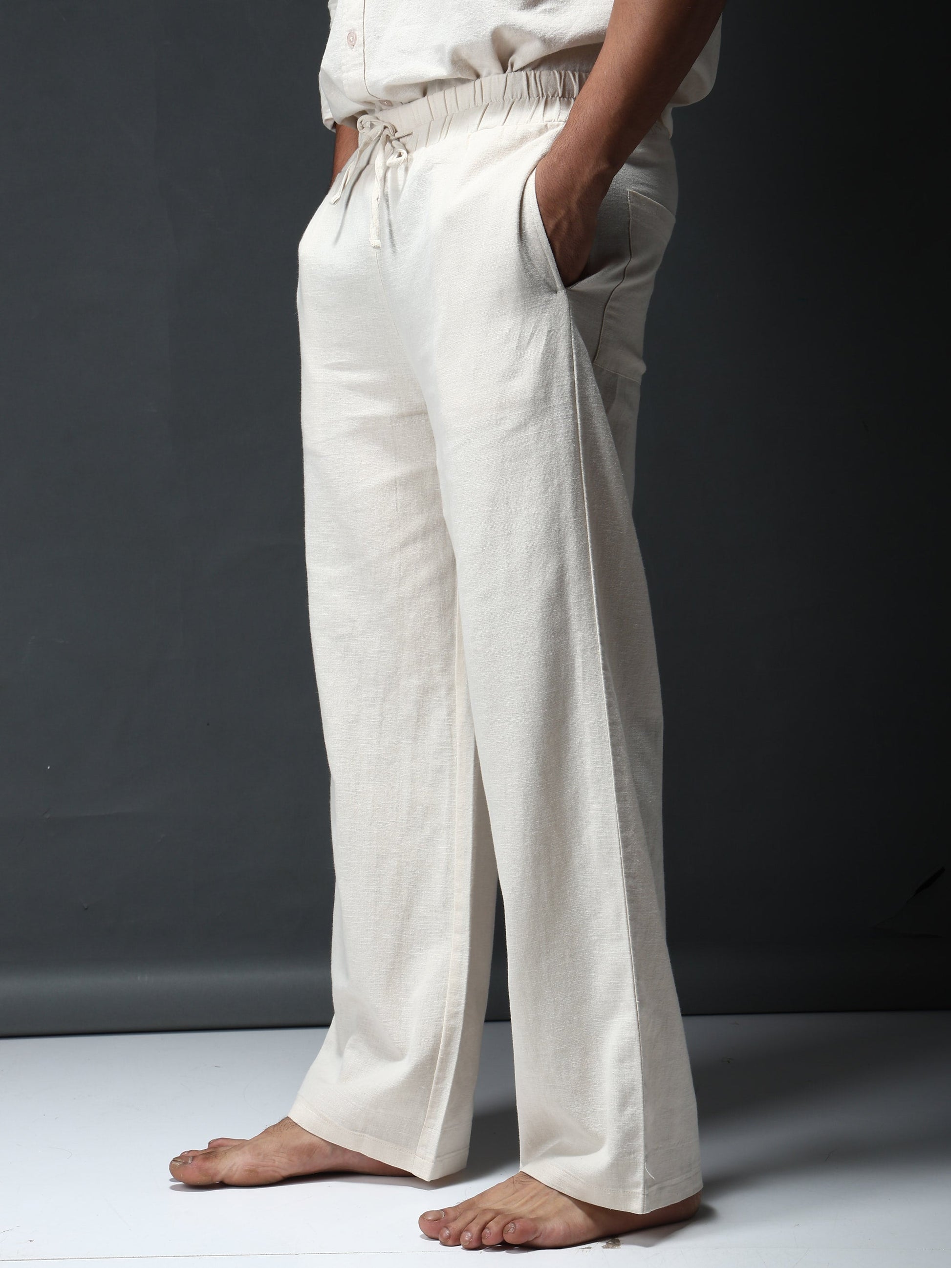 Crafted from a lightweight linen-cotton blend, these off-white pants offer breathable comfort and a relaxed fit. Perfect for effortless styling, they bring a clean, minimal aesthetic ideal for both casual and semi-formal looks.