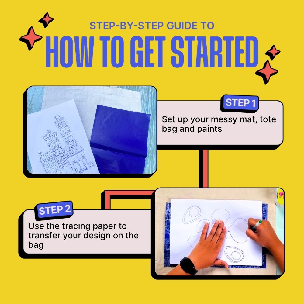1. Complete Kit: Includes a 100% cotton tote bag, fabric paints, palette, carbon paper, ballpoint pen, paint brushes, fixer, and a messy mat.