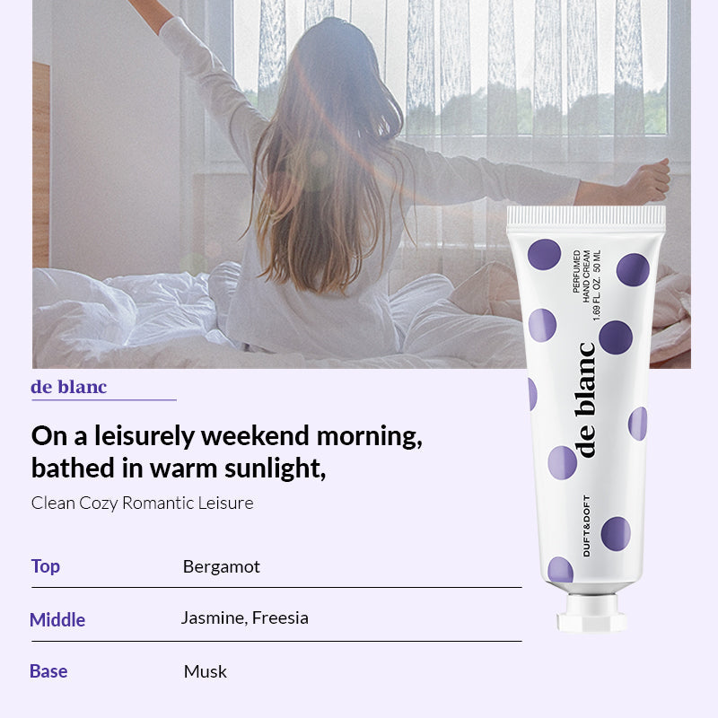 DUFT & DOFT Niche Perfume Hand Cream – De Blanc wraps hands in indulgent moisture while leaving behind a refined, long-lasting scent. Sparkling bergamot blends with soft jasmine and freesia before settling into a clean, musky base—an expression of understated elegance and calm luxury.