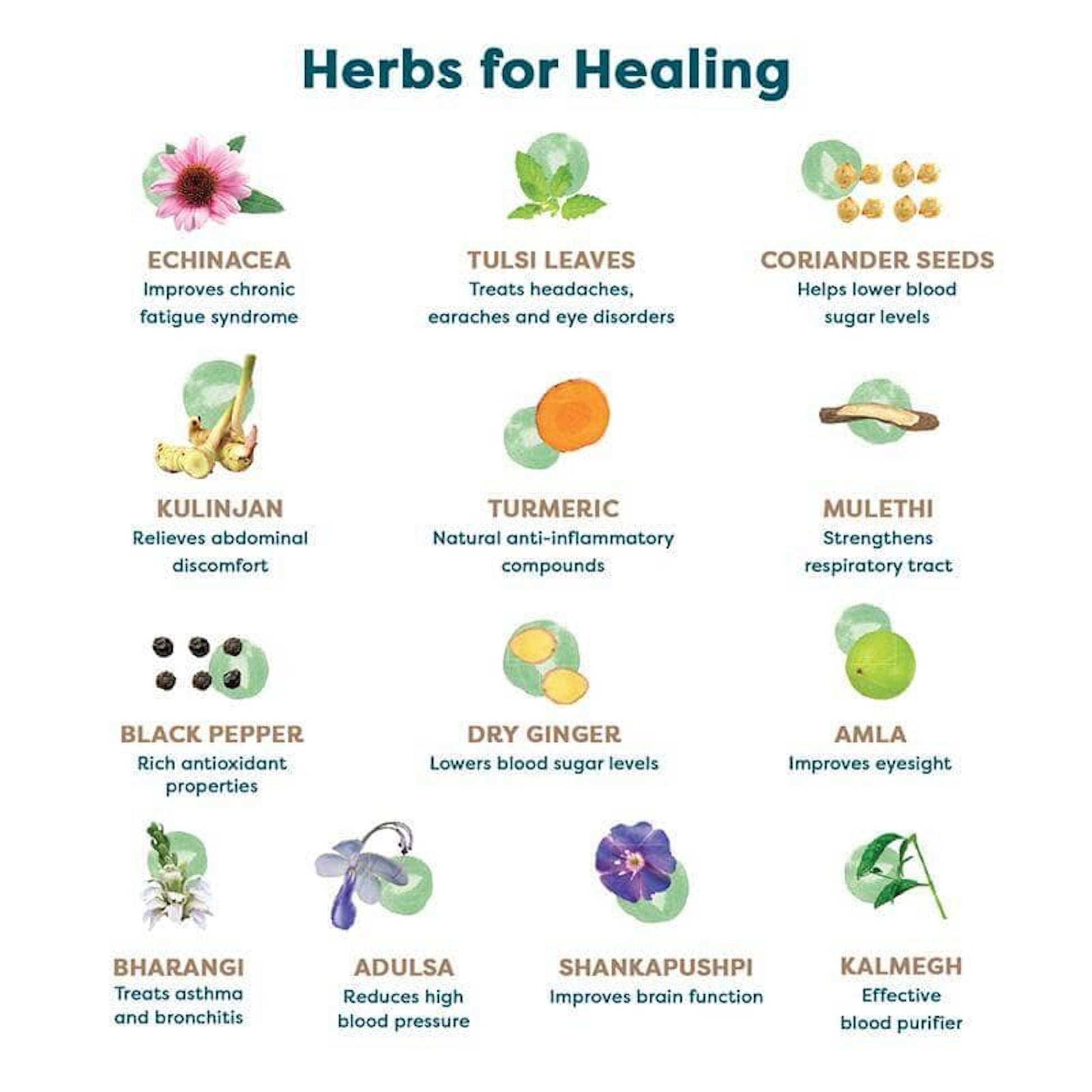 Formulated with Echinacea, Kulinjan, Coriander seeds, Tulsi, Mulethi, Turmeric, Amla, Ginger, Black Pepper, Shankapushpi, Kalmegh, Bharangi, and Adulsa.