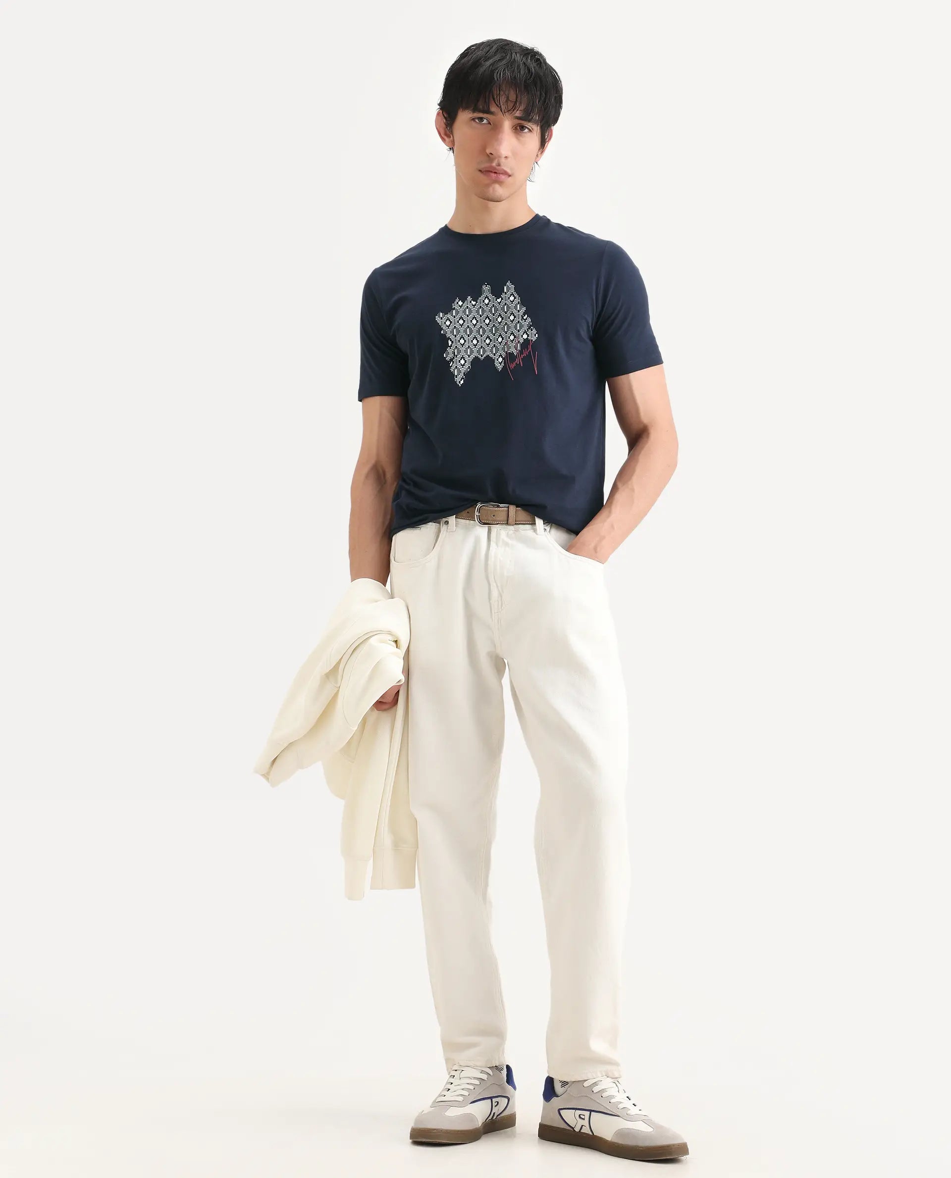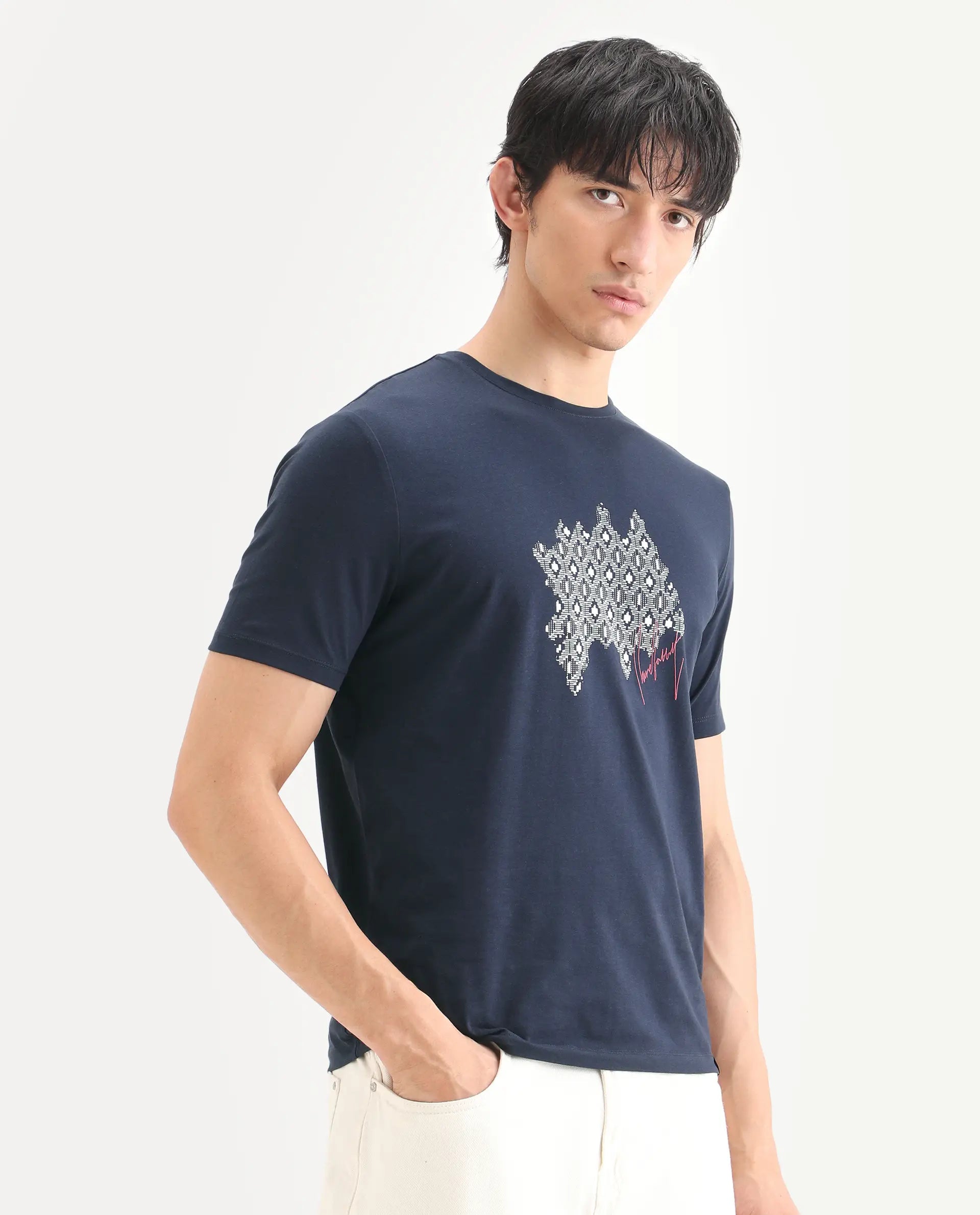 Rare Rabbit Men's Erine Navy Cotton Blend Fabric Half Sleeve Crew Neck Regular Fit Graphic Print T-Shirt Experience effortless style with this versatile navy t-shirt from Rare Rabbit. Crafted from a premium cotton blend, it delivers superior comfort and breathability for everyday wear. The classic crew neck and regular fit provide a timeless silhouette that works seamlessly across casual and smart-casual settings. A striking graphic print adds visual interest without compromising sophistication.