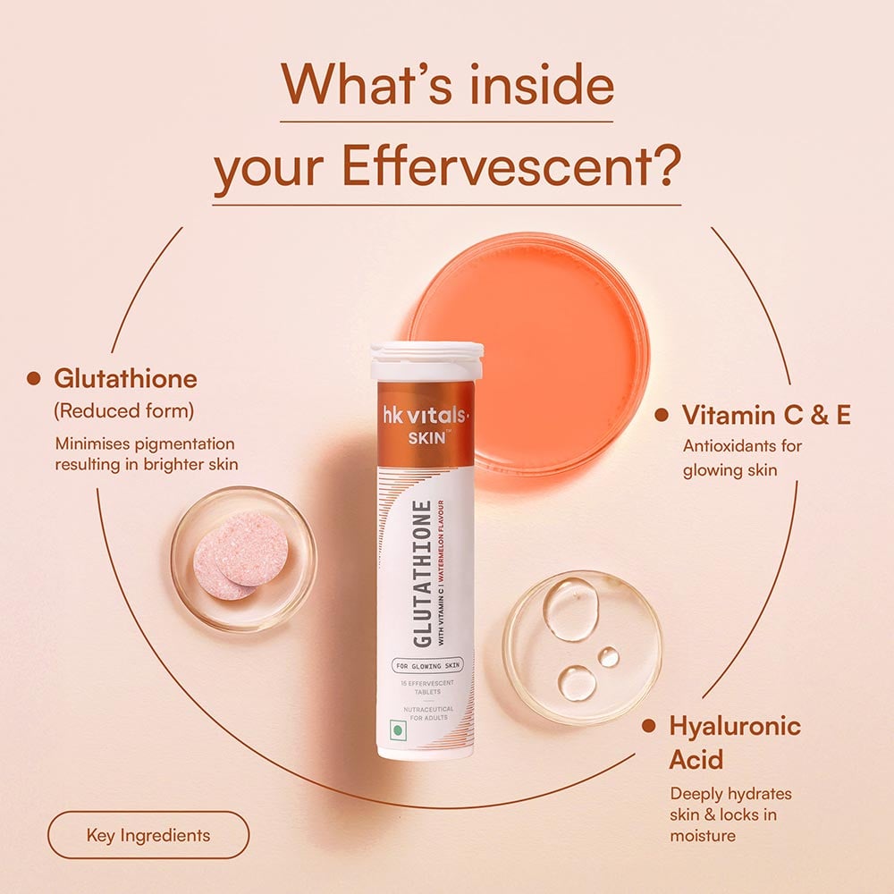 HK Vitals Glutathione Effervescent Tablets use L-Glutathione, a stable and bioactive form that is efficiently absorbed. When combined with Vitamin C, it helps sustain glutathione activity within cells, ensuring continuous antioxidant protection for the skin.