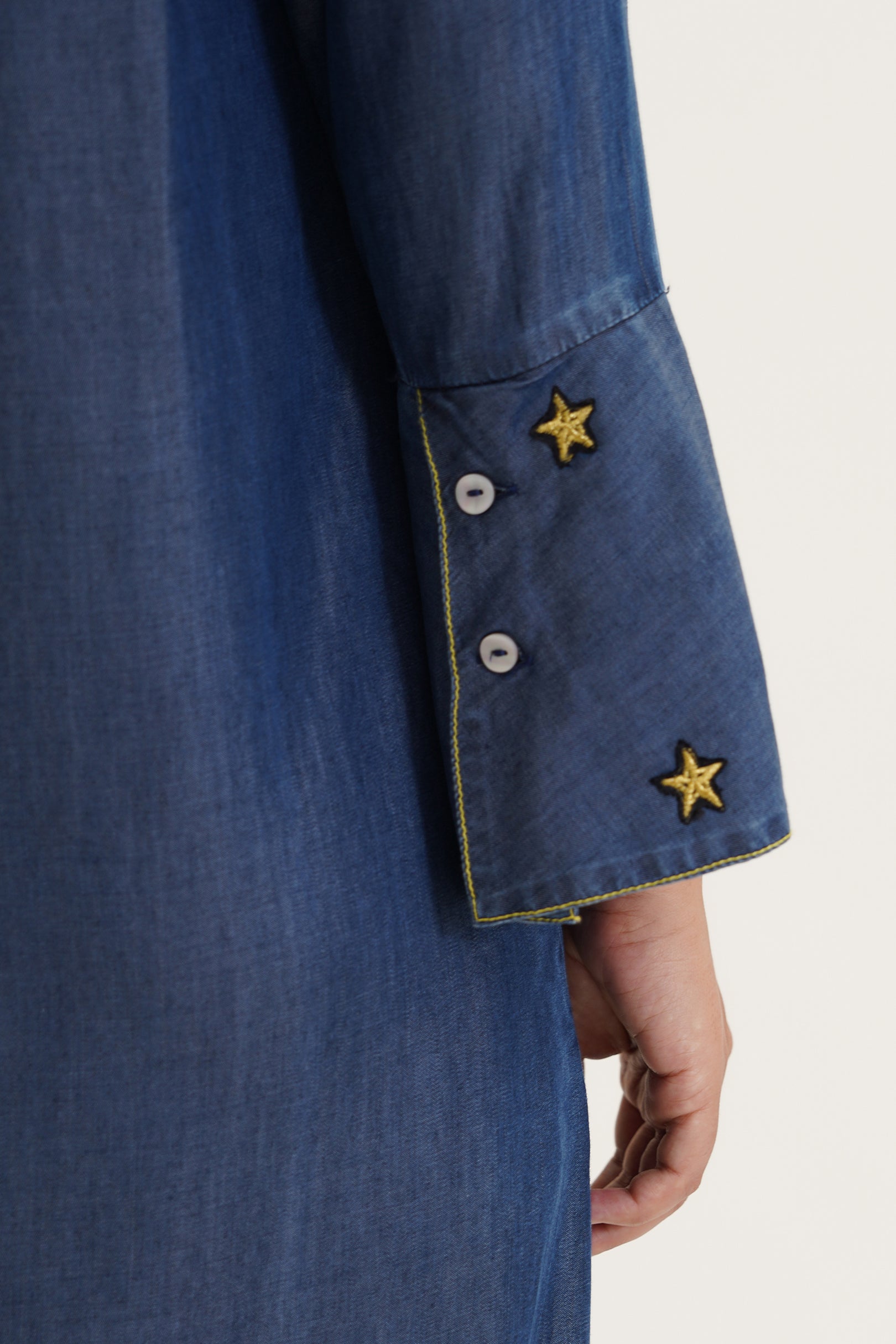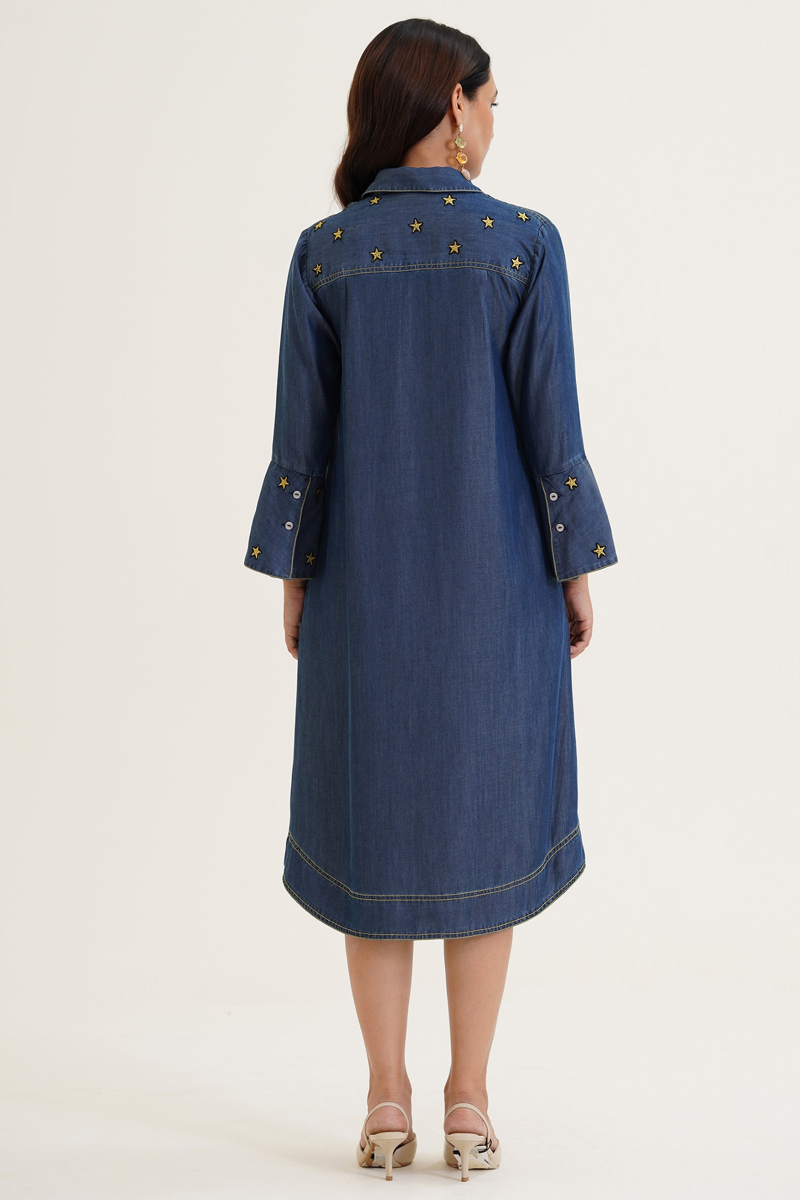 Dress adorned with charming honey bee and star embellishments on the front and sleeve cuffs.