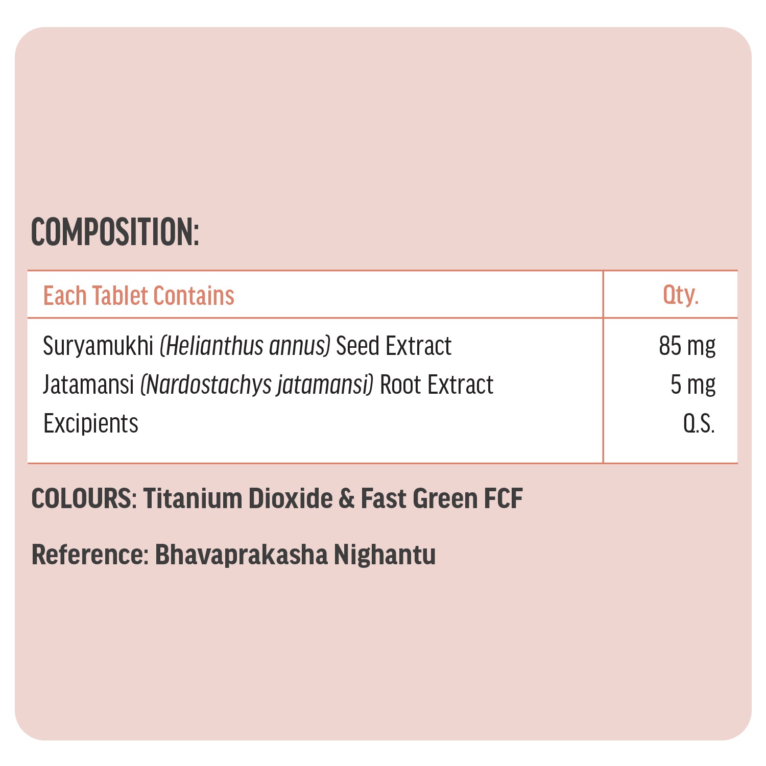 Suryamukhi (sunflower) seed extract and Jatamansi root extract. Refer to product packaging for complete ingredient and allergen information.