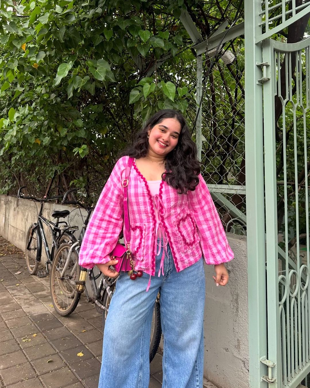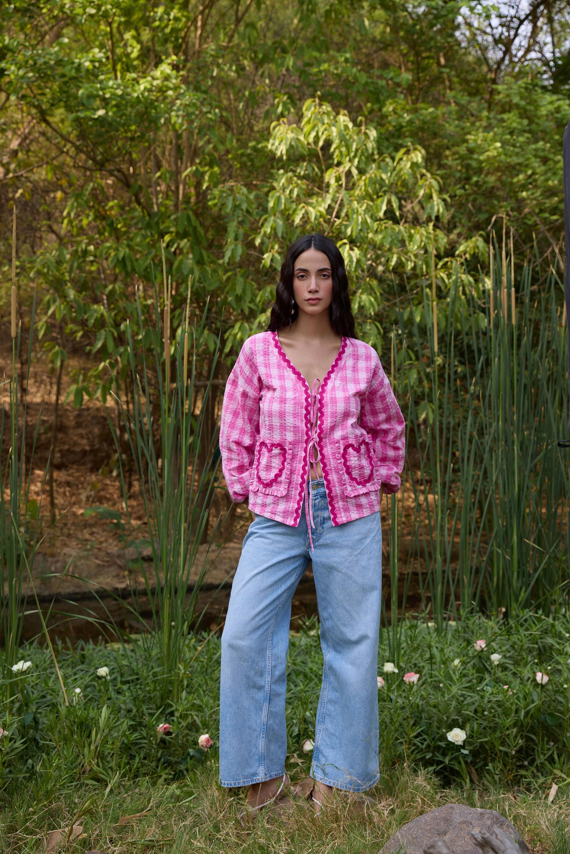 Elevate your wardrobe with our Heart Applique Shirt Top. The charming gingham style, front tie-up, and blouson design exude elegance and femininity. The delicate heart applique contrast lace adds a touch of romance. Perfect for a sophisticated and stylish look.