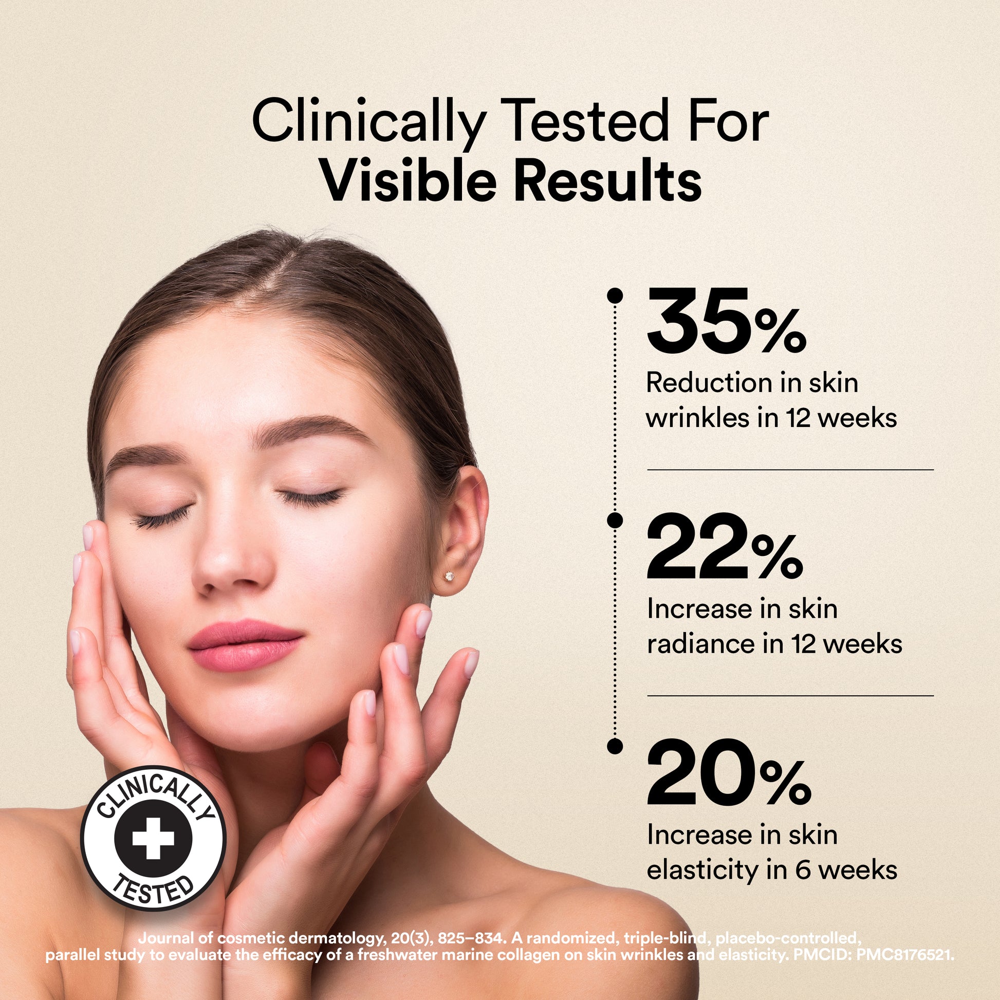 Contains hydrolyzed marine collagen peptides (Type I & III) sourced from deep-sea salmon.