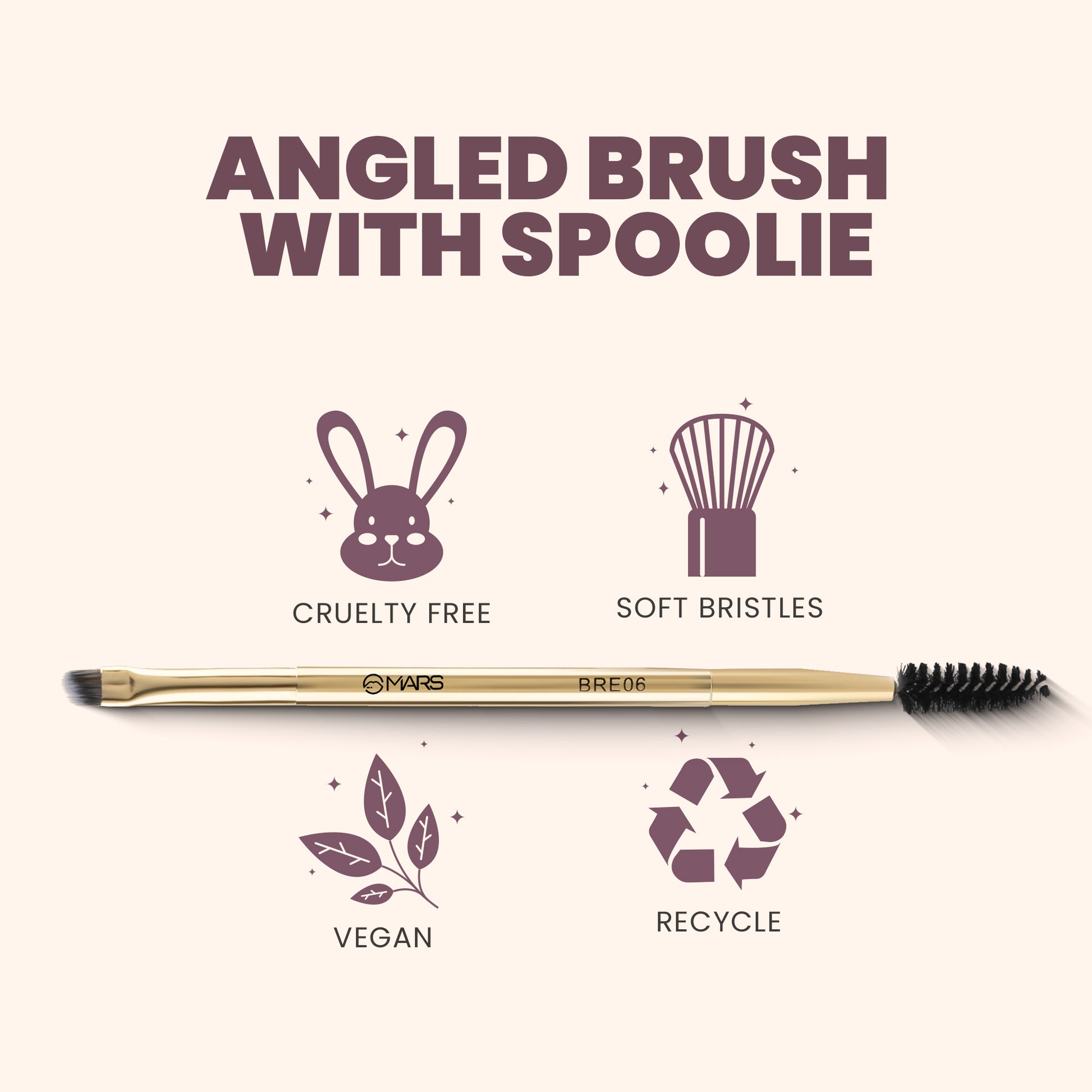 MARS Angled Brush with Spoolie is a dual ended brush. The angled side can be used for multiple uses like eyebrow filling and eyeliner application. The spoolie end is used to brush the eyebrows.
