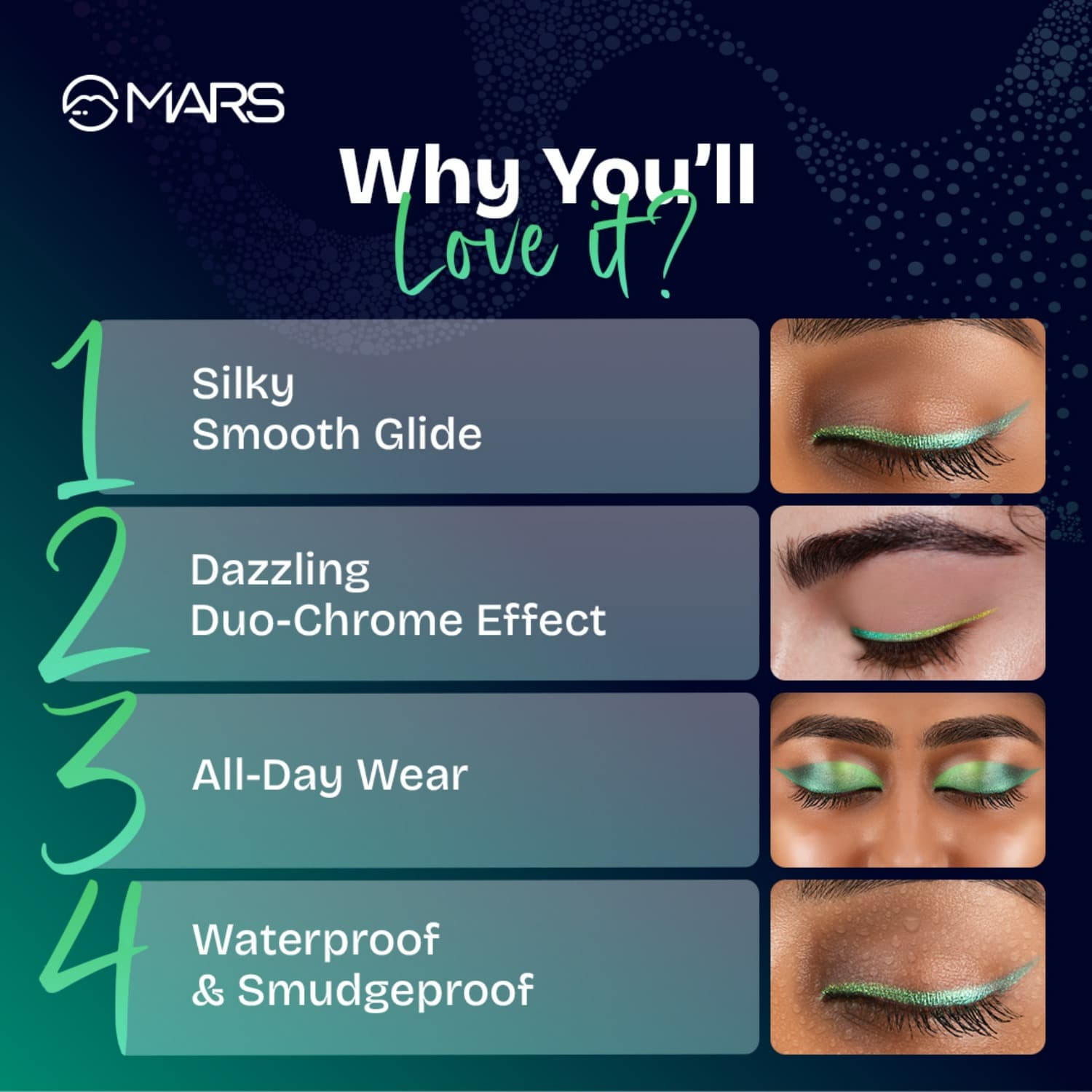 Light up your eyes with this duo-chrome eyeliner that changes color as you move. Its highly pigmented formula creates a stunning multi-chrome effect, adding depth and dimension to your look. Perfect for a subtle pop or a bold statement, this eyeliner’s shimmering finish instantly elevates your eye game.