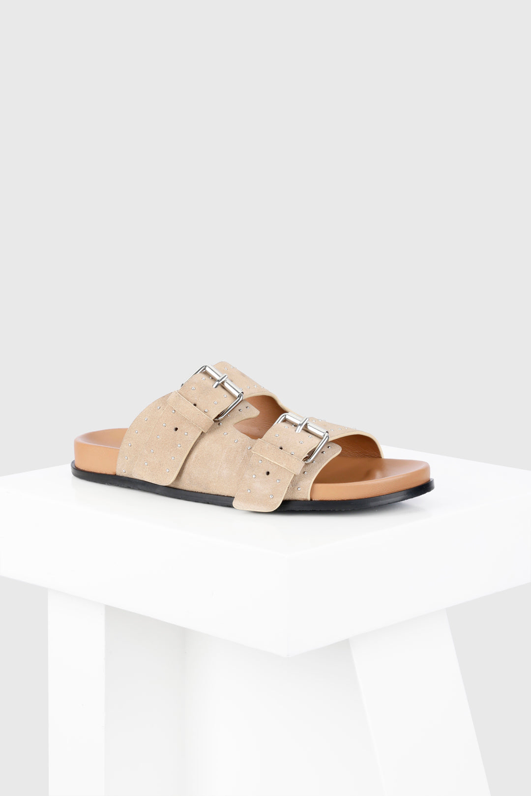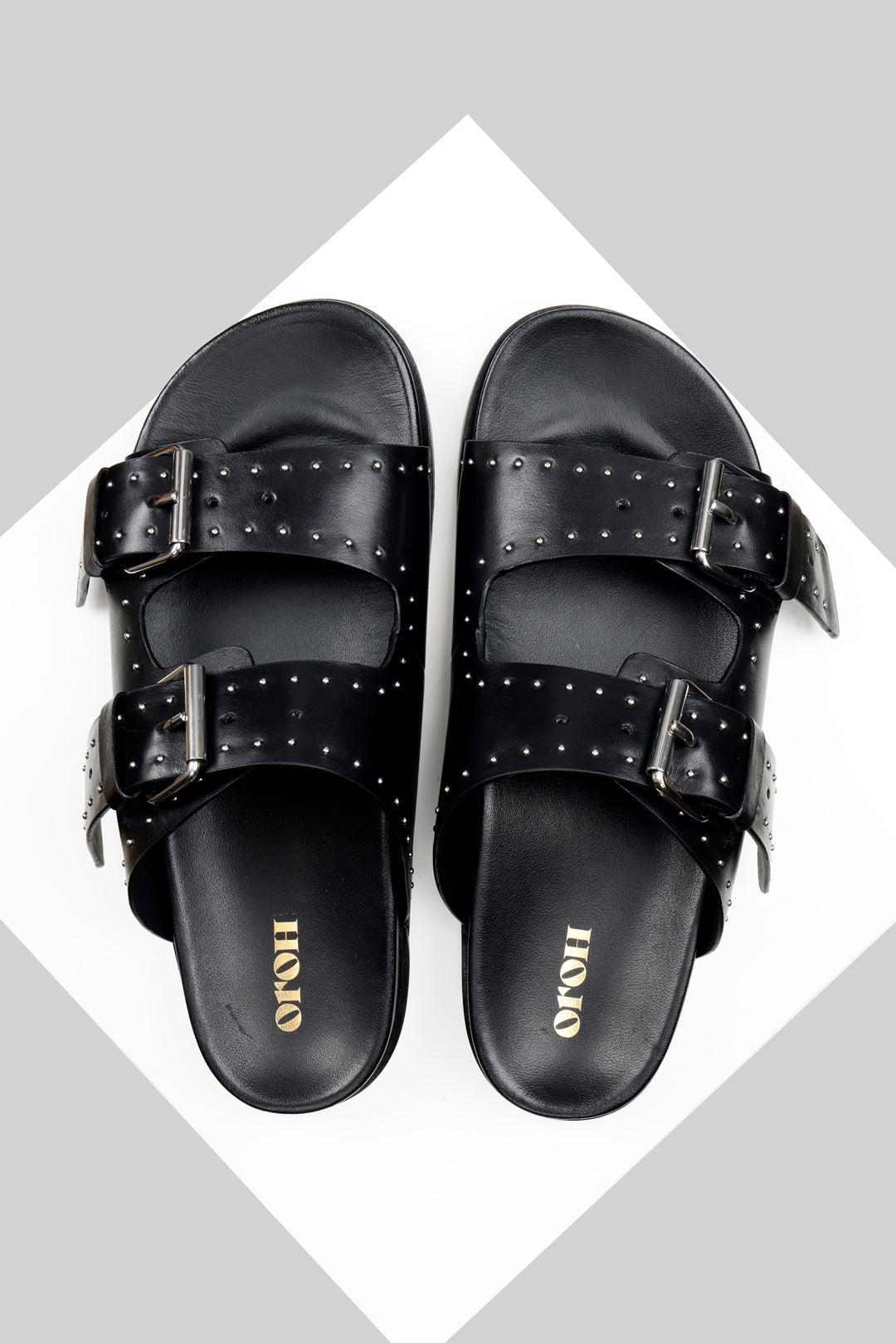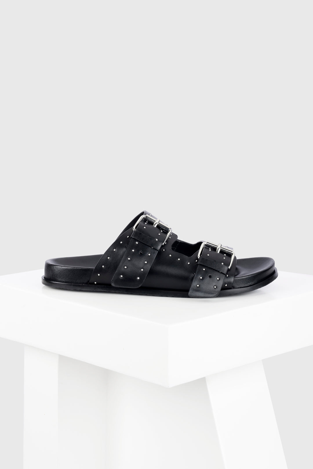 Meilila is a flat sandal with a studded buckle upper. The dualbuckle straps and the classic colours combine with the comfortable leathercovered footbed to make an everyday essential for your wardrobe. All our sandals are designed in Europe and manufactured using premium leather.