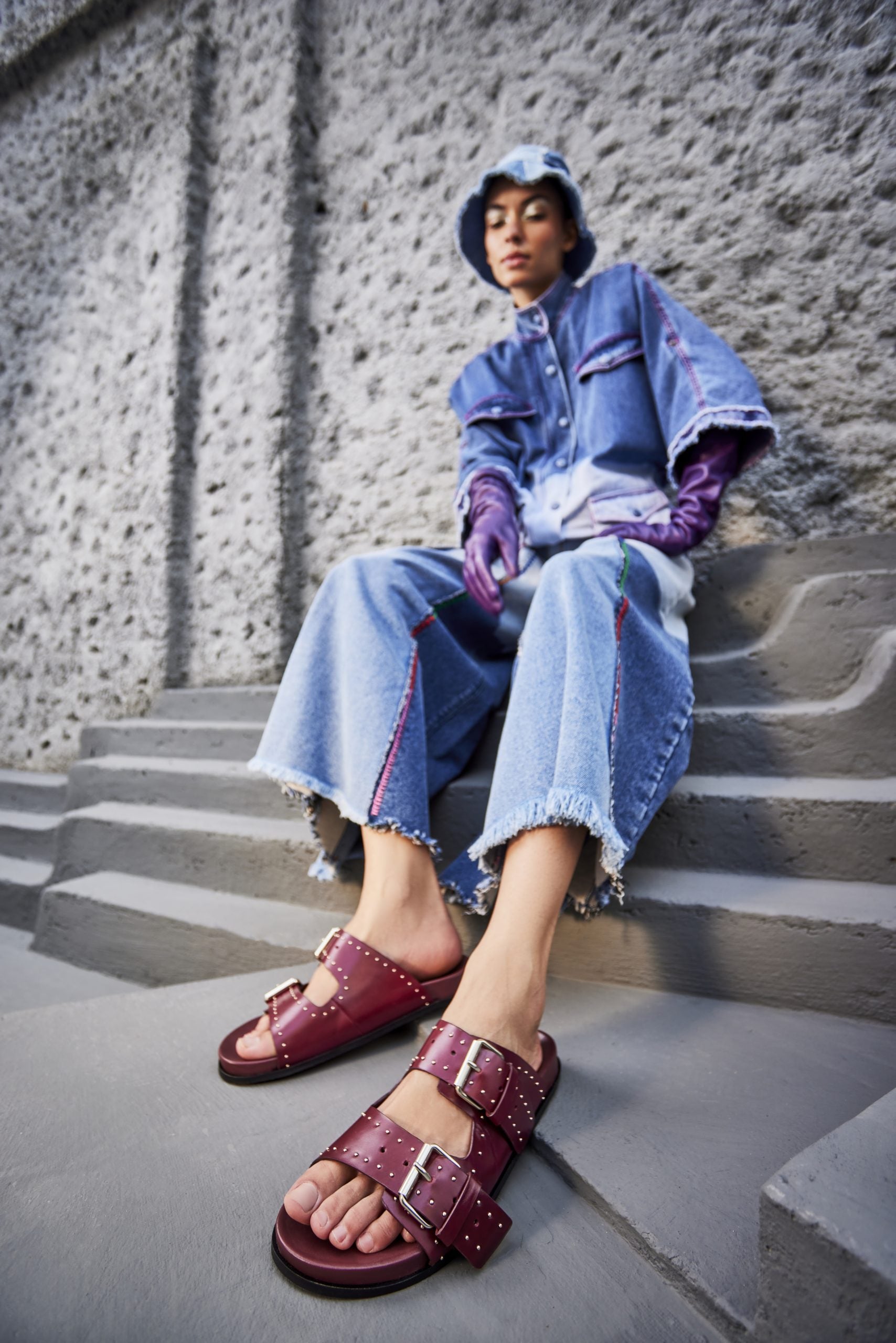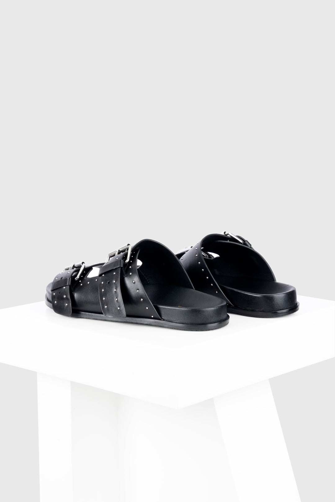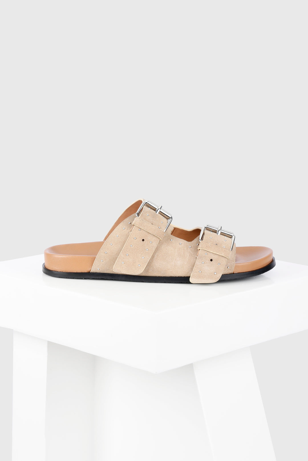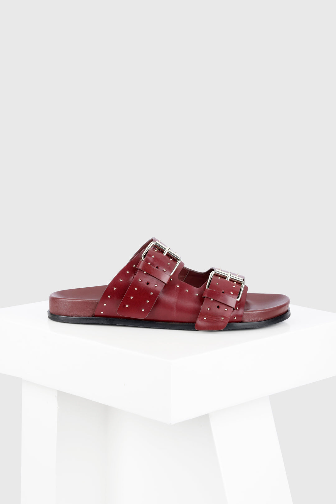 Meilila is a flat sandal with a studded buckle upper. The dualbuckle straps and the classic colours combine with the comfortable leathercovered footbed to make an everyday essential for your wardrobe. All our sandals are designed in Europe and manufactured using premium leather.