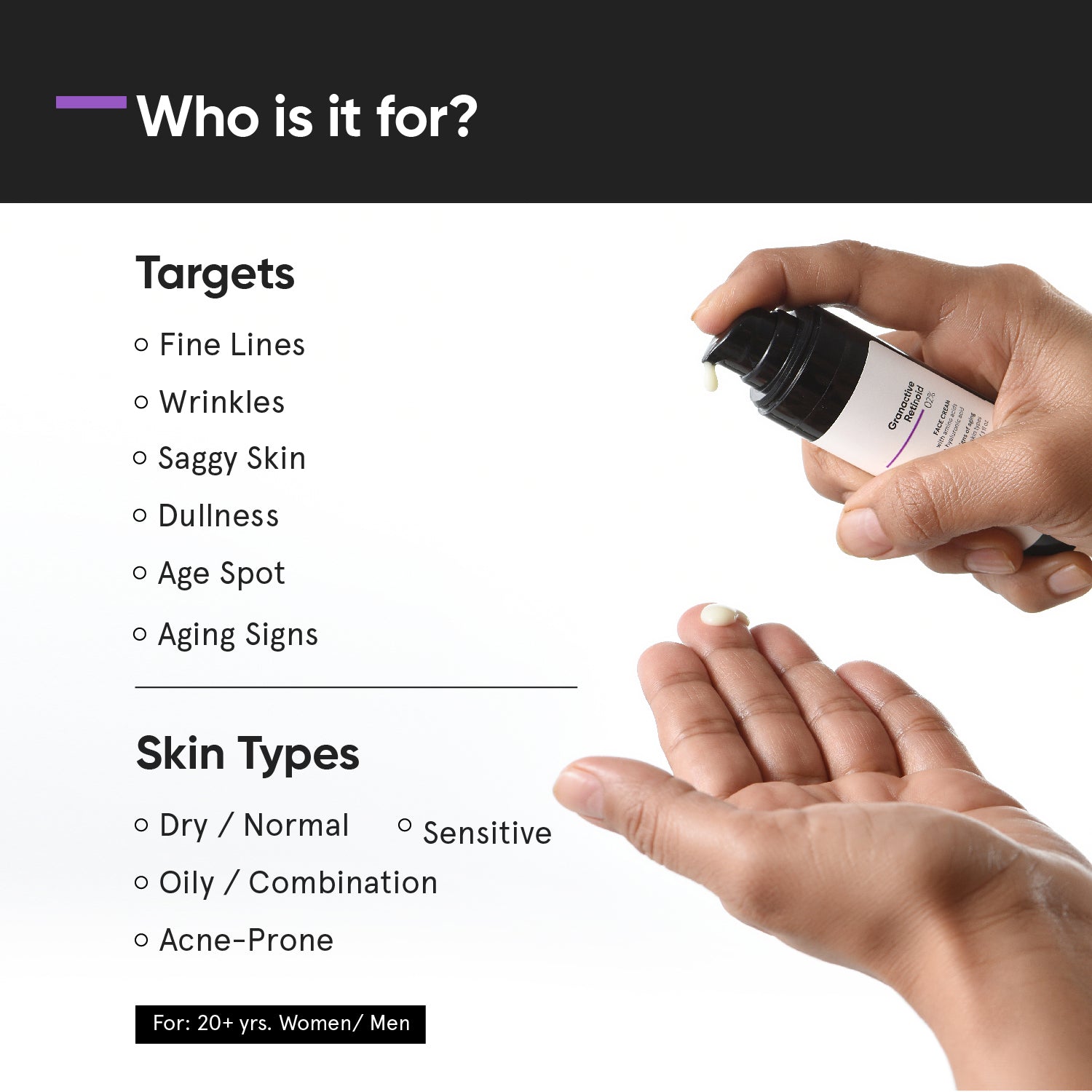 Formulated with new-age, bio-available, non-prescription forms of Vitamin-A. Granactive Retinoid decreases the effects of UV induced skin damage and visibly reduces fine lines & wrinkles.