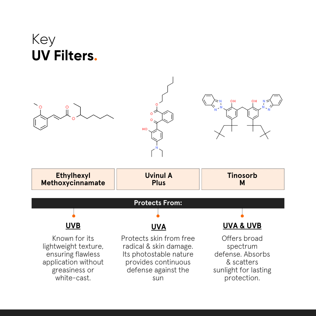 A lightweight, non-tacky, water & sweat resistant, fast-absorbing formula, providing SPF 50 & PA ++++ with an ideal ratio (3:1) of SPF to UVA as per EU recommendation. With Broad-Spectrum protection against UV radiation, it also protects against blue light. Clinically tested In-vivo (on humans) in the US FDA approved lab. It ensures a moisturized feel along with a flawless finish without any white cast, pilling and irritation.
