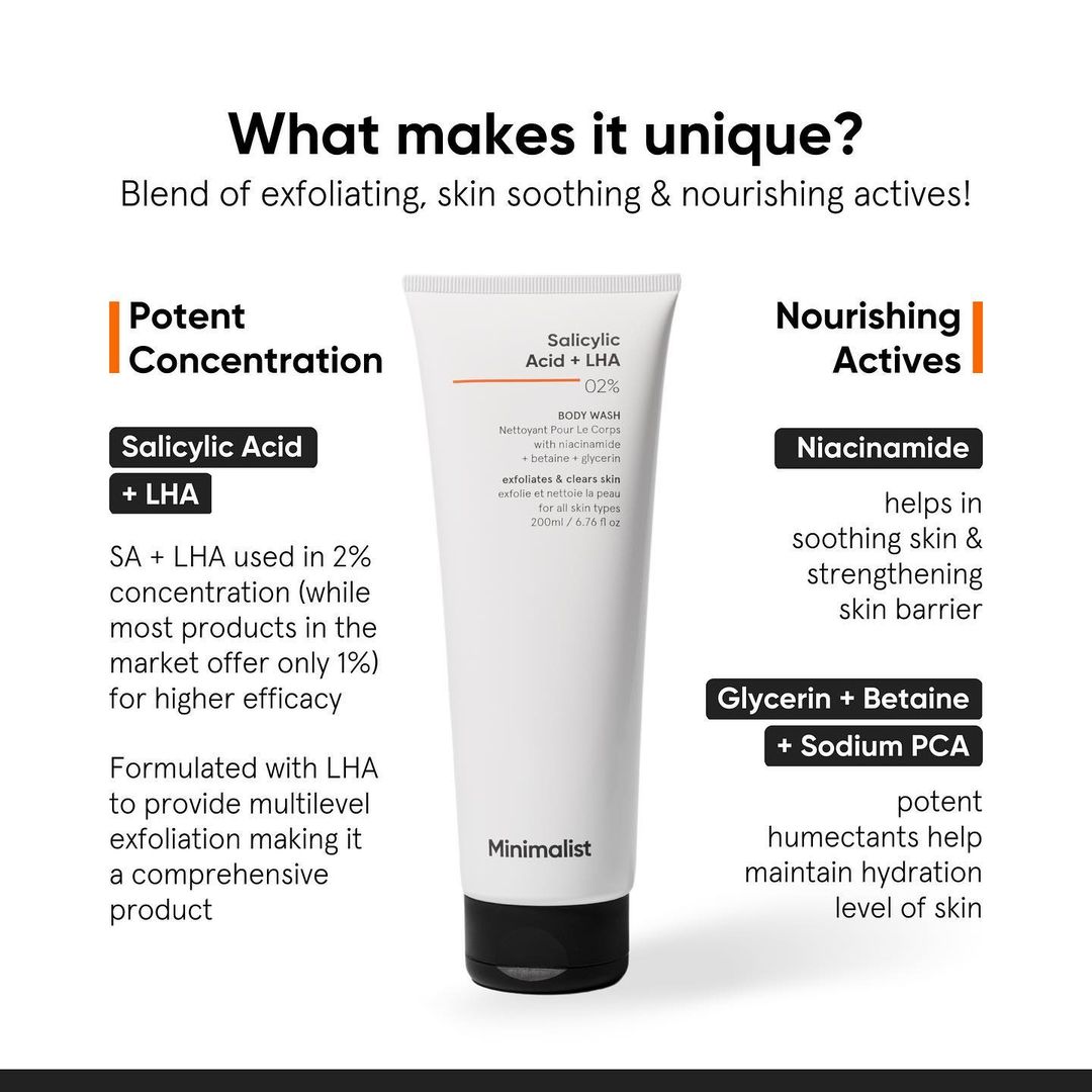 A gentle, exfoliating body wash that provides bump-free soft skin without compromising the skin barrier. It contains a powerful combination of Salicylic Acid (BHA) + LHA in a combination of 2% with mild surfactants.