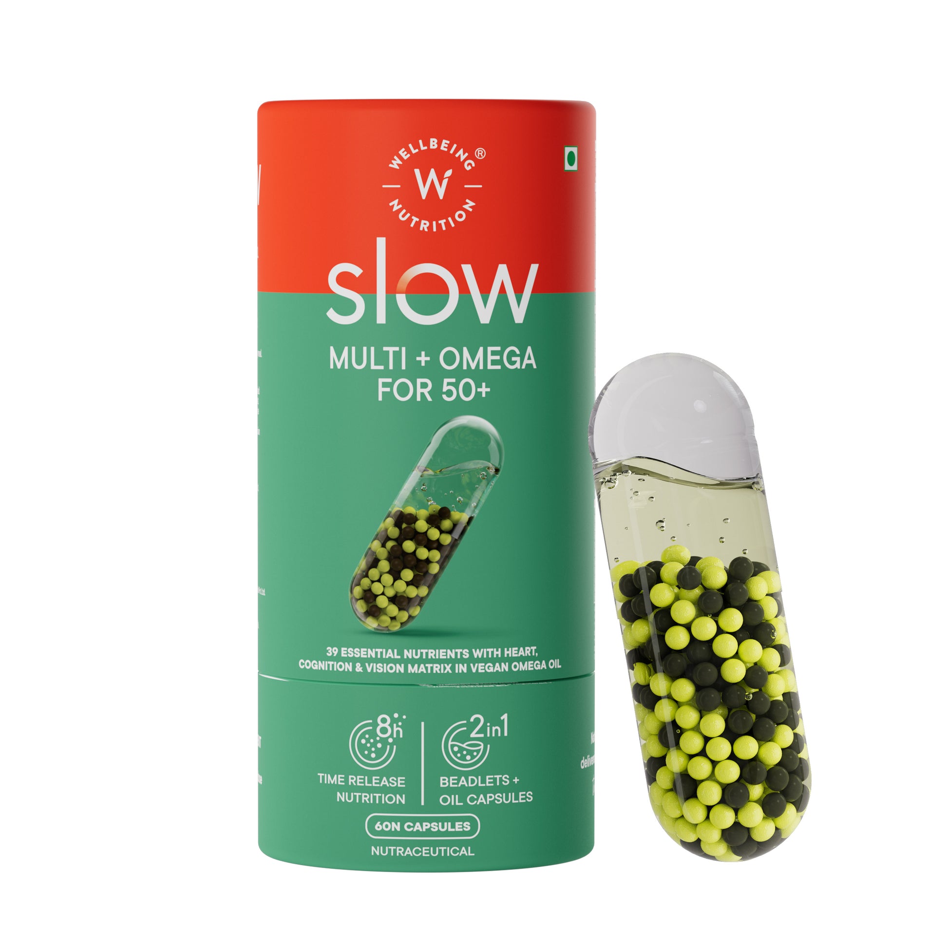 Wellbeing Nutrition’s Multi + Omega 50+ Slow is thoughtfully formulated to support the evolving nutritional needs of adults aged 50 and above. The advanced formula combines vegan DHA-rich algal oil with 39 clinically validated vitamins, minerals, and functional nutrients to help support bone strength, joint comfort, cardiovascular health, and cognitive function.