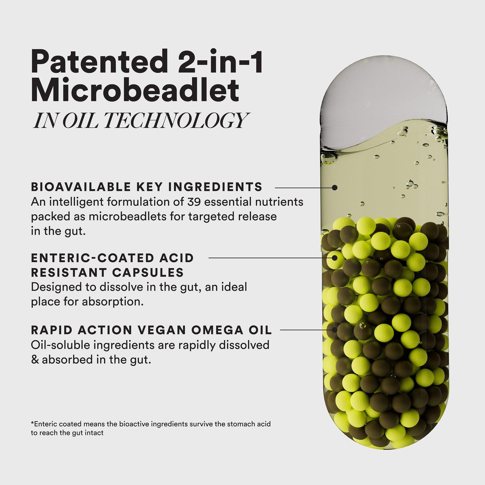 Advanced microbeadlets ensure sustained nutrient release and consistent absorption throughout the day.