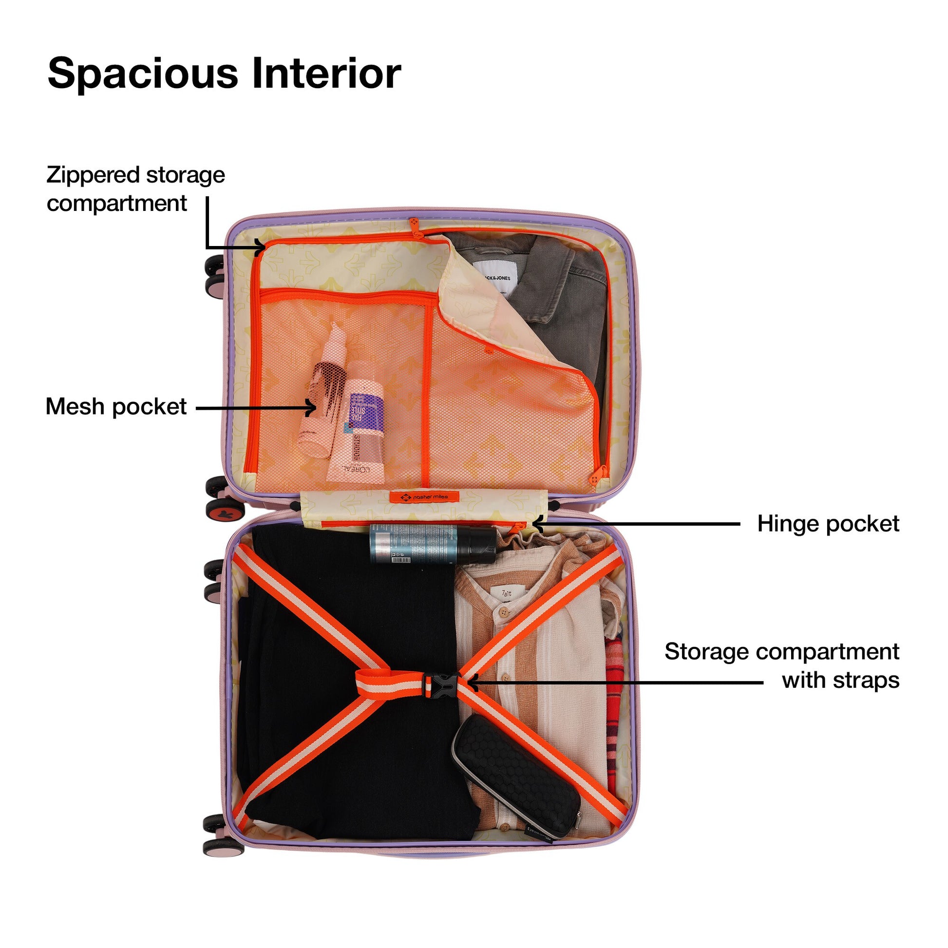 Wet Pouch and Premium Interiors: Compression straps, a hinge pocket, a zipped pocket, three mesh pockets, a wet pouch, and two roomy sections make packing easy and tidy.