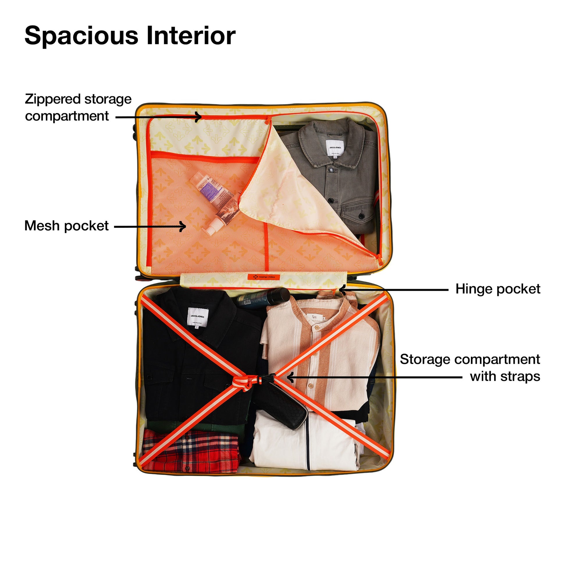 Durable Travel Suitcase (Large): Designed for extended vacations or international trips, this large, hard-shell polypropylene suitcase combines exceptional durability with practicality. With a 20 kg carrying capacity, it features flat top opening and mid opening for quick access, making it easy to pack in small spaces.