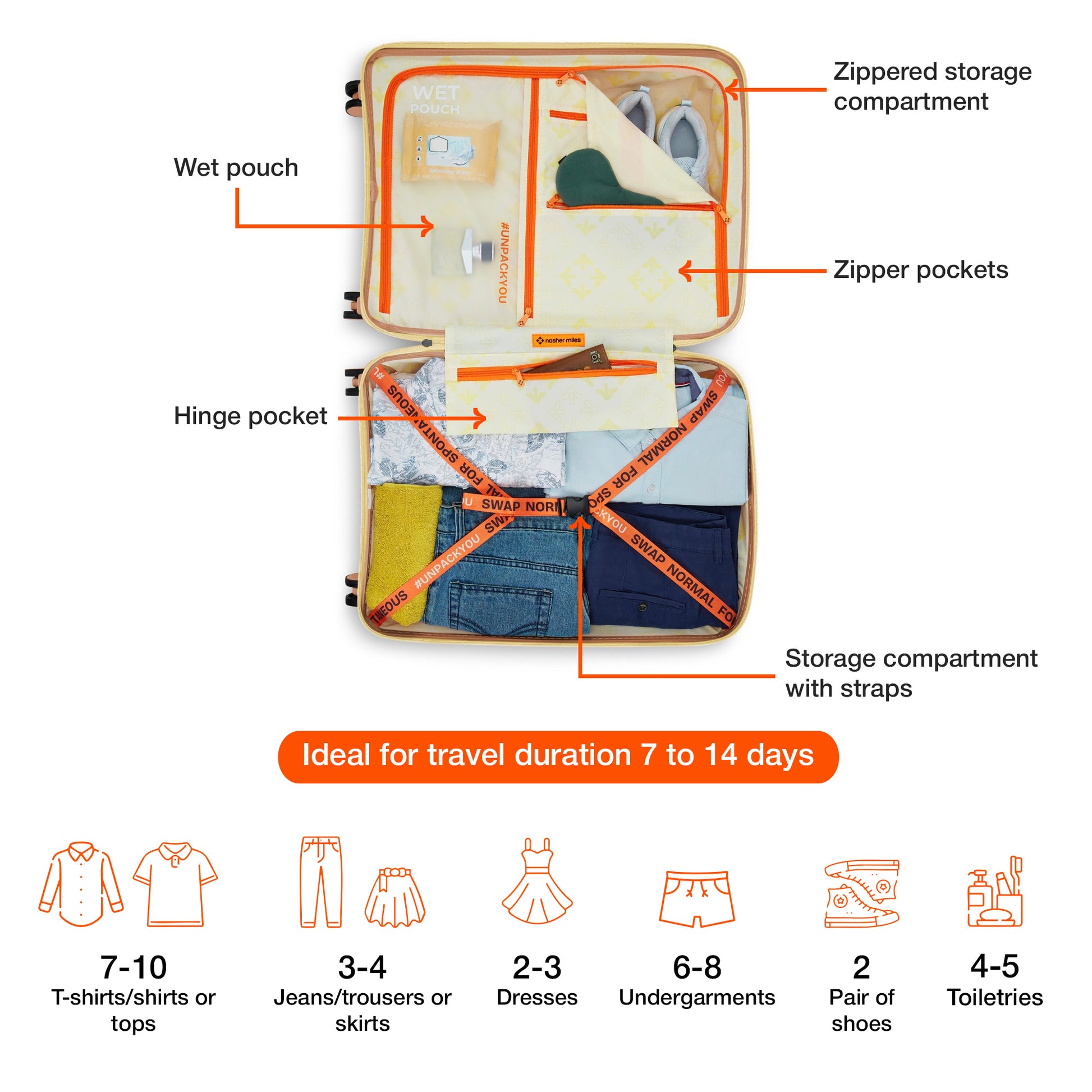 Smart Interior Organization: The interior is thoughtfully crafted with a premium lining and multiple storage solutions to keep your belongings perfectly arranged. It includes compression straps to secure clothing, zippered mesh compartments for essentials, a dedicated wet pouch for toiletries or damp items, and additional mesh pockets for smaller accessories. Designed to keep everything neat, visible, and easily accessibleso you stay organized and mess-free throughout your journey.