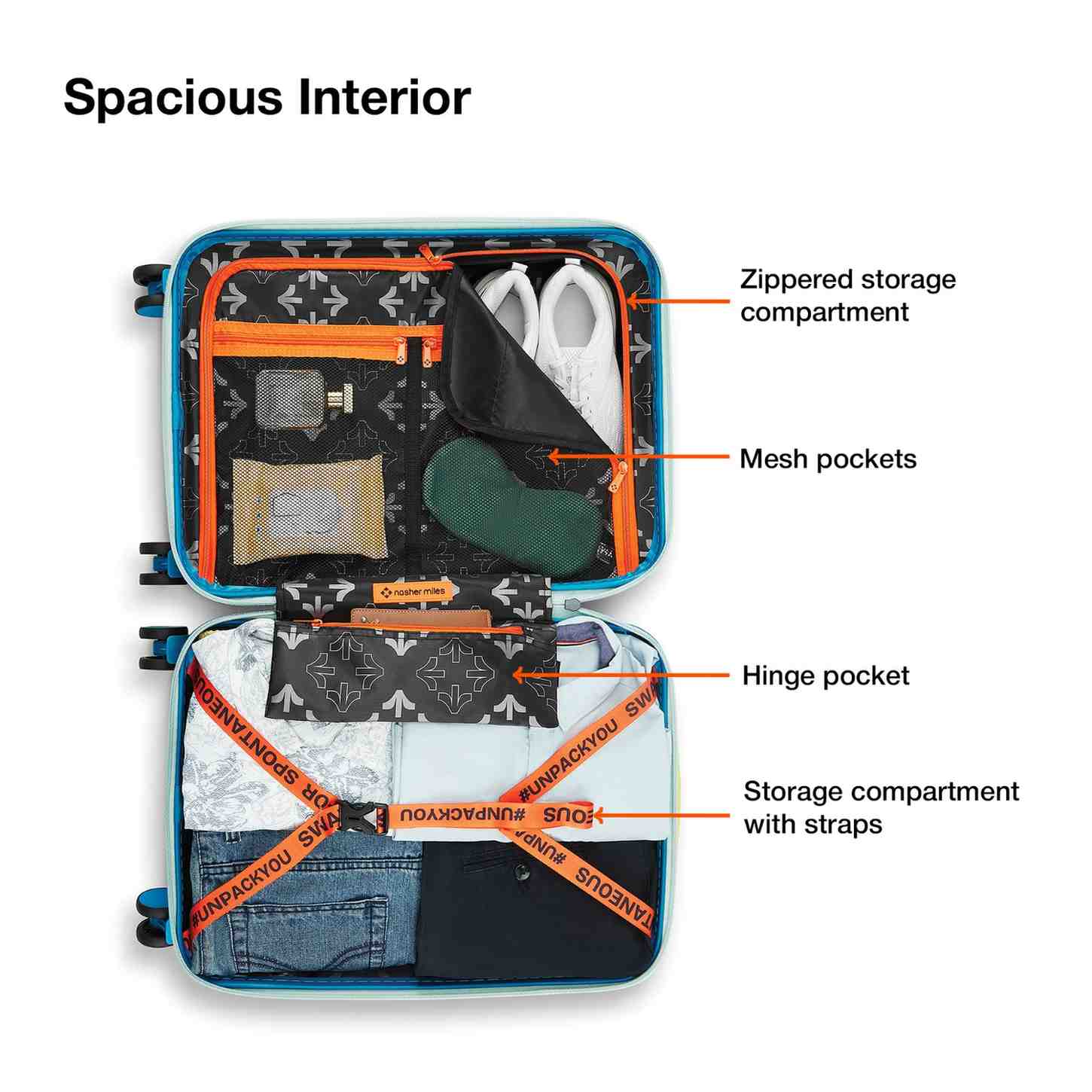 Secure and organized interior with down straps, a zippered divider, 2 mesh pockets, and a hinged pocket; side-mounted TSA lock for theft deterrence and easy access.