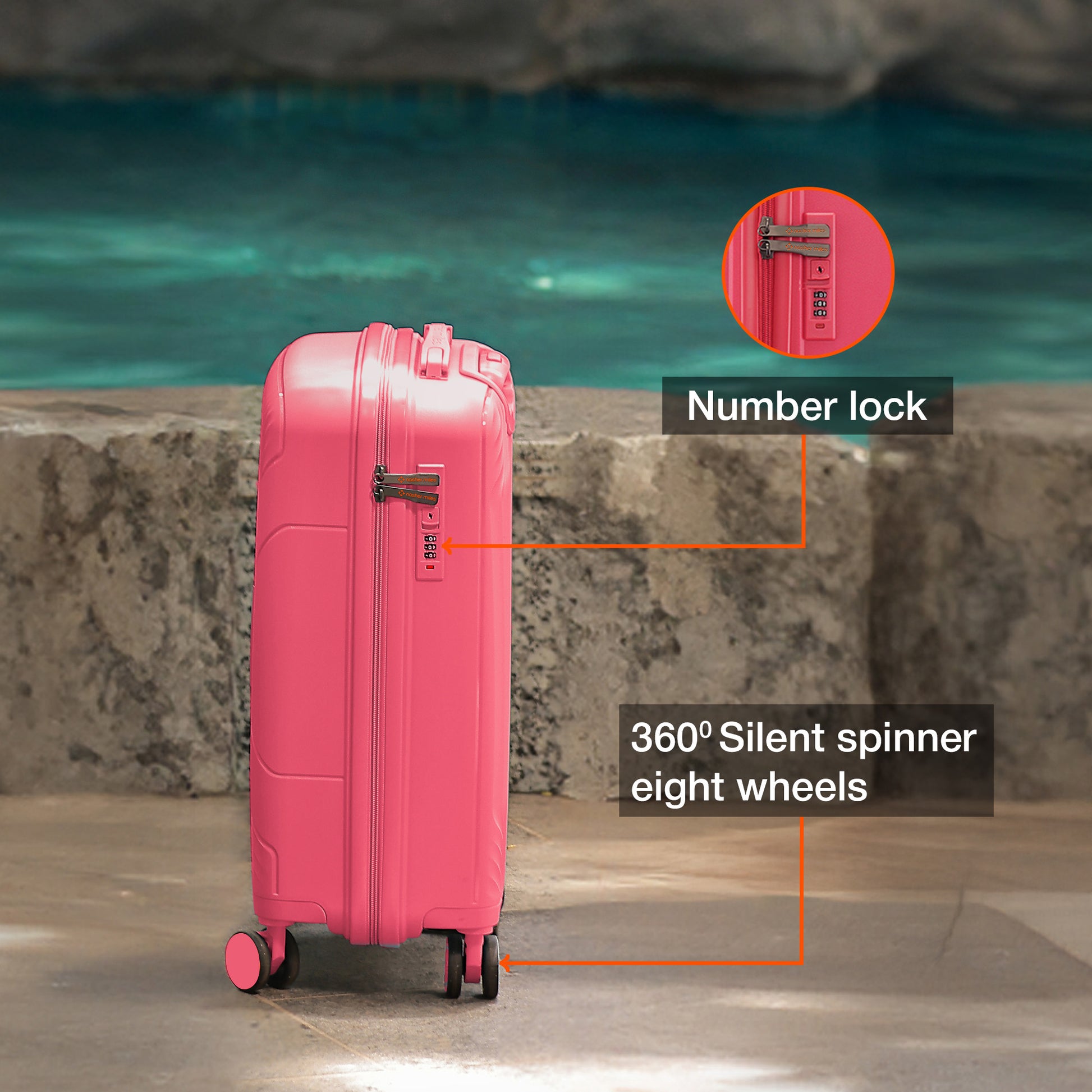 Lightweight And Durable Material: Crafted from unbreakable polypropylene material, the Nasher Miles carry-on luggage (55 / 20 inches) is designed to meet the carry-on limitations of most major airlines worldwide. It fits conveniently in the overhead compartment, eliminating additional handling fees and carry up to 15 kg of weight, perfect for short trips lasting 2-3 days.Secure Your Valuables: Safeguard your belongings effortlessly with the integrated number lock included in our lightweight luggage. This added security feature ensures your items stay protected while allowing for easy access during inspections and travel.Effortless 360° Spinner Luggage: Experience a seamless journey with the 8 multi-directional ball bearing mounted spinner wheels, the perfect balance of fluidity and control to navigate seamlessly through every destination, enjoying unparalleled mastery over every movement.Pack Smart, Pack More: Our travel suitcase optimizes your packing volume. Its two main compartments, complete with compression straps, hold your clothes and belongings securely while reducing creases. A specially designed built-in pocket caters to smaller items. Every inch is thoughtfully designed to deliver maximum storage, so you can carry and travel more.Warranty: 3 Years warranty on shell & 1 year warranty on accessories. Wear & Tear for product under use and scratches are not covered.