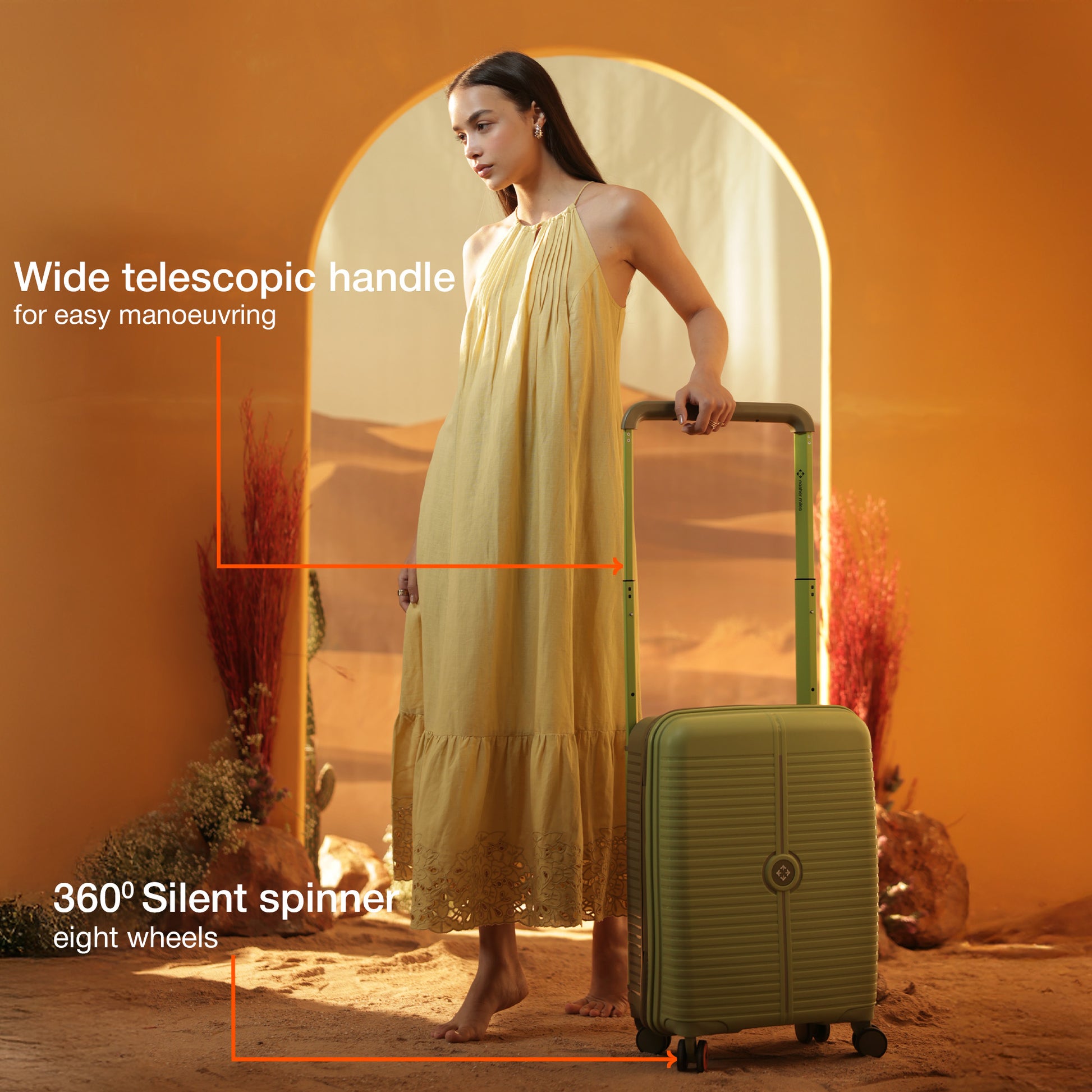 Easily navigates with 8 spinner wheels and a sturdy wide aluminium telescopic handle for comfort and control. The sleek striped design adds a stylish touch.