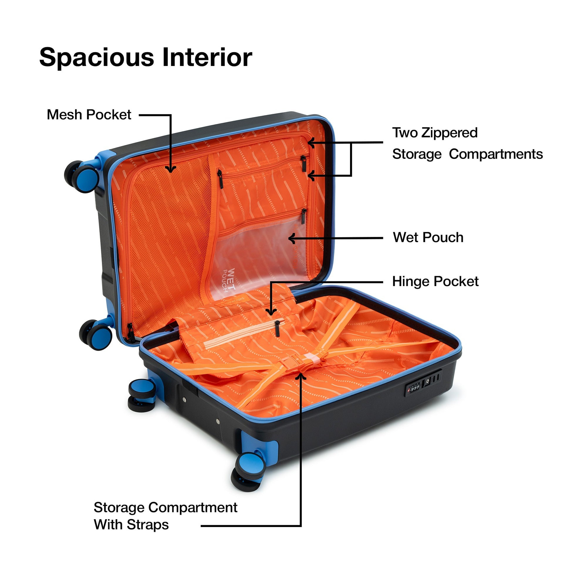 Organized Interior with Wet Pouch: Designed for convenience, the interior includes two main compartments—one with a zippered divider and the other with elastic straps. It also features a mesh pocket, a hinge pocket, a zipped storage pocket, and a wet pouch for storing wet clothes or toiletries prone to spillage.