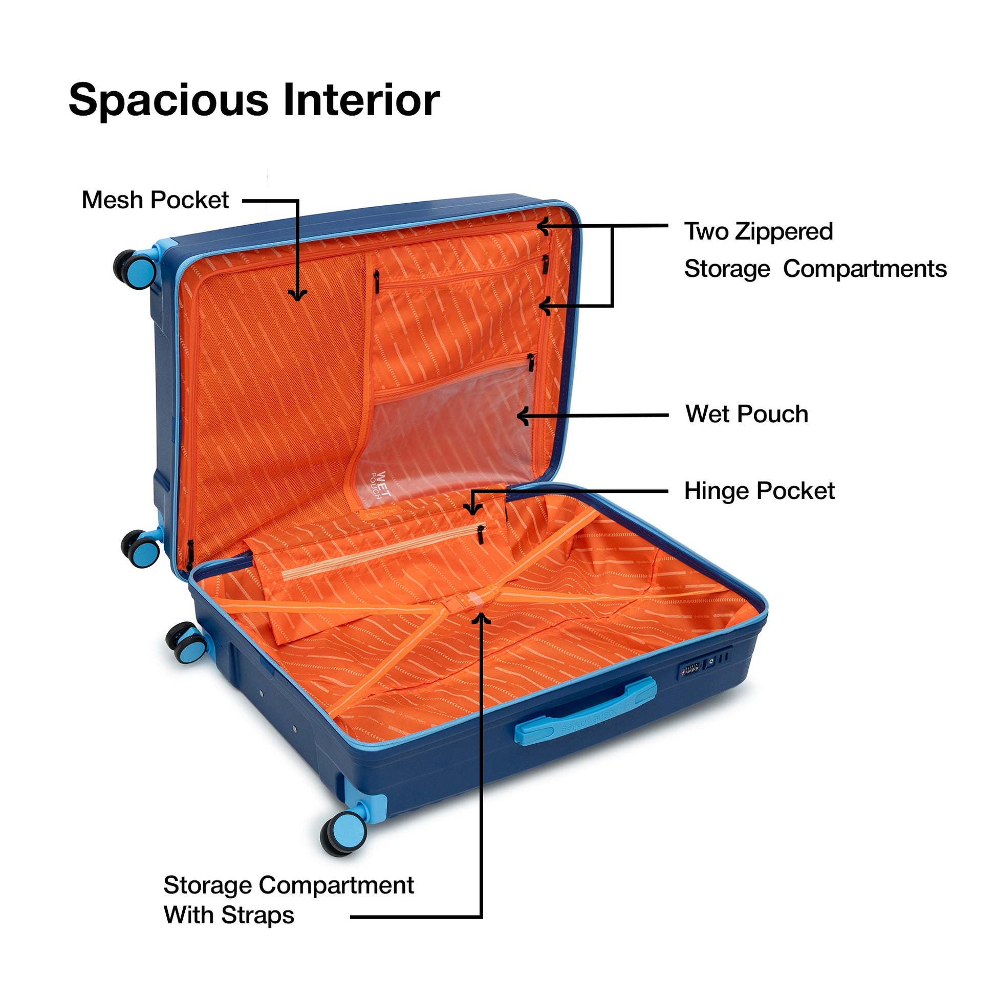 Organized Interior with Wet Pouch: Designed for convenience, the interior includes two main compartmentsone with a zippered divider and the other with elastic straps. It also features a mesh pocket, a hinge pocket, a zipped storage pocket, and a wet pouch for storing wet clothes or toiletries prone to spillage.