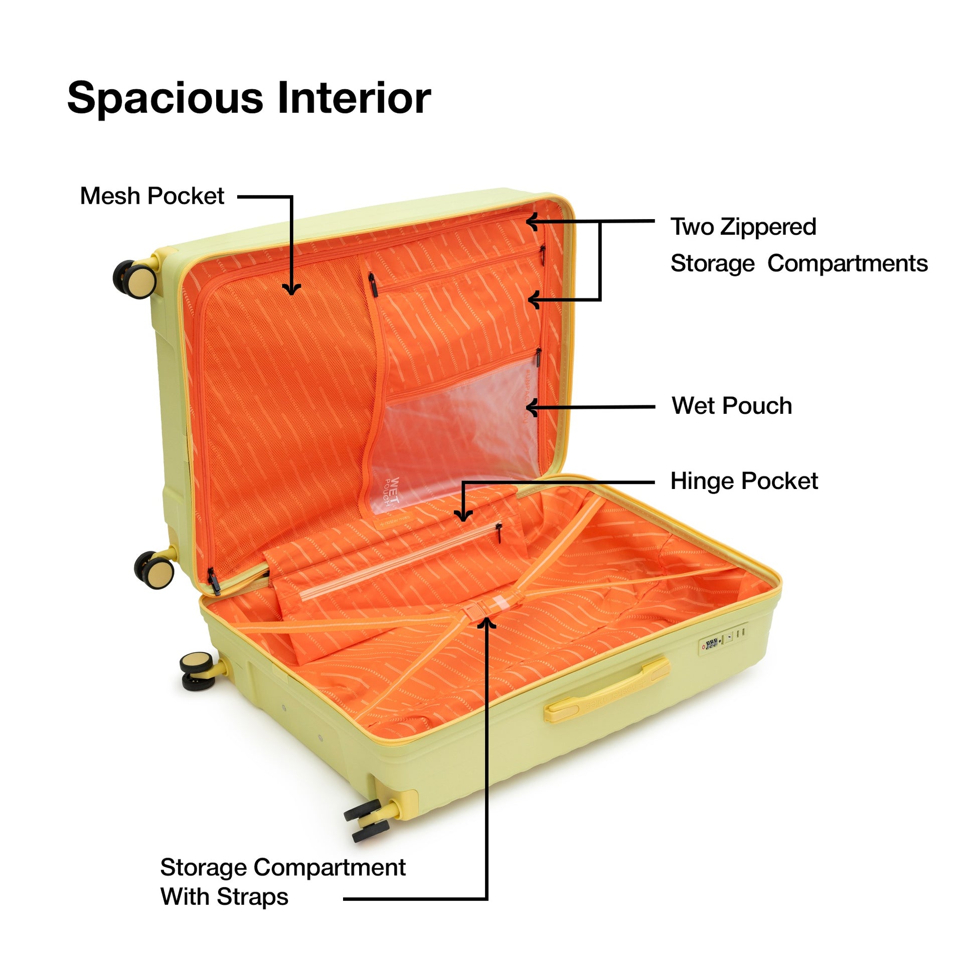 Organized Interior with Wet Pouch: Designed for convenience, the interior includes two main compartmentsone with a zippered divider and the other with elastic straps. It also features a mesh pocket, a hinge pocket, a zipped storage pocket, and a wet pouch for storing wet clothes or toiletries prone to spillage.
