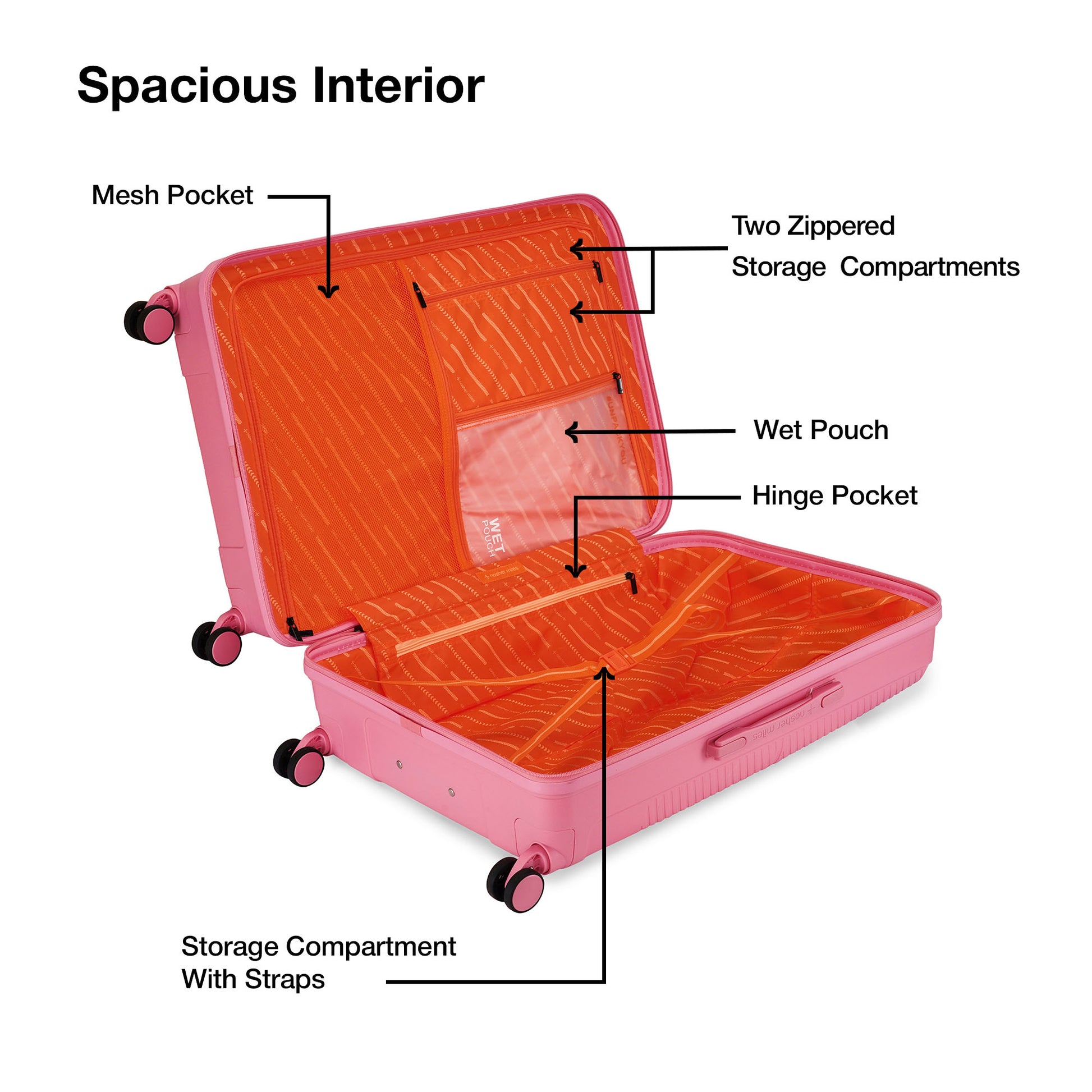 Organized Interior with Wet Pouch: Crafted for convenience, the interior features two main compartmentsone with a zippered divider and the other with elastic straps.Additionally, there are one mesh pocket, a hinge pocket, and a wet pouch for wet clothes or toiletries prone to spillage.