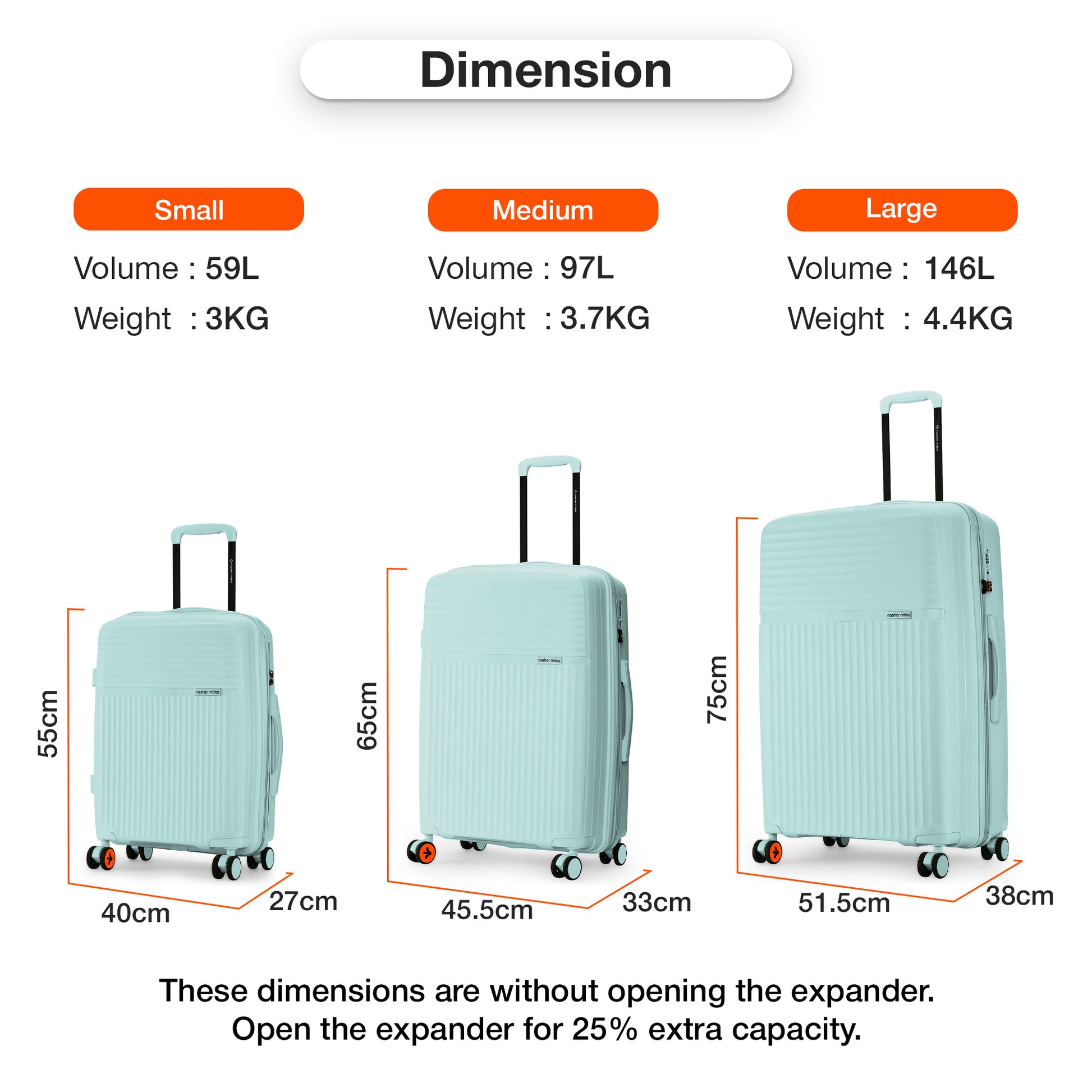 Small (S) Lightweight Hard-Side Cabin Luggage (55/20 inches): Travel with our small cabin-sized luggage crafted from unbreakable polypropylene material, offering long-lasting durability and protection for your belongings. This compact yet durable luggage is designed to carry up to 10-15 kg of weight and can accommodate materials for a short trip of 2-3 days.
