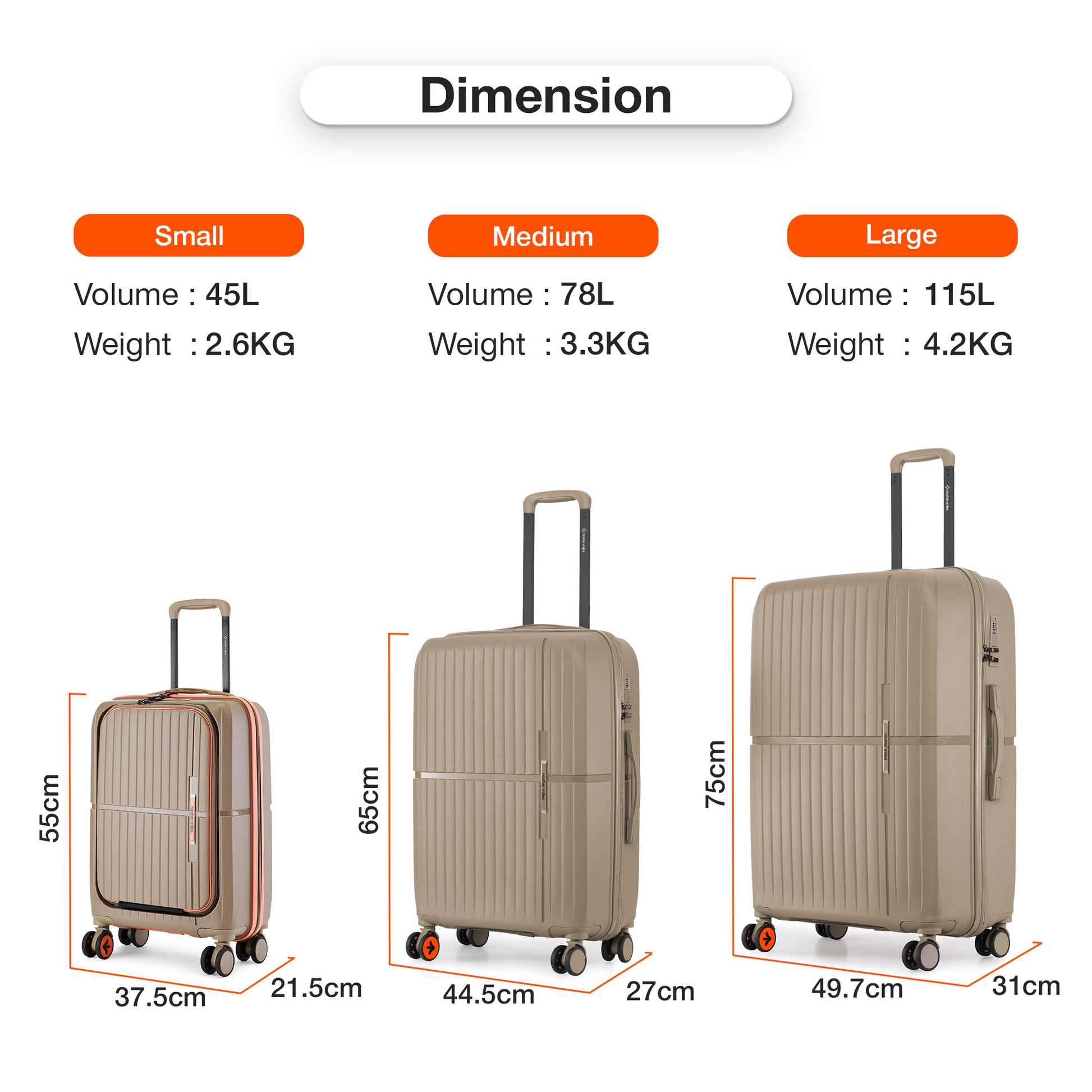 Small (S) Lightweight Hard-Side Cabin Luggage (55/20 inches): Travel with our small cabin-sized luggage crafted from unbreakable polypropylene material, offering long-lasting durability and protection for your belongings. This compact yet durable luggage is designed to carry up to 10-15 kg of weight and can accommodate materials for a short trip of 2-3 days.It comes with a quick access front compartment with multiple pockets for essentials like documents and a laptop, ensuring unmatched convenience.
