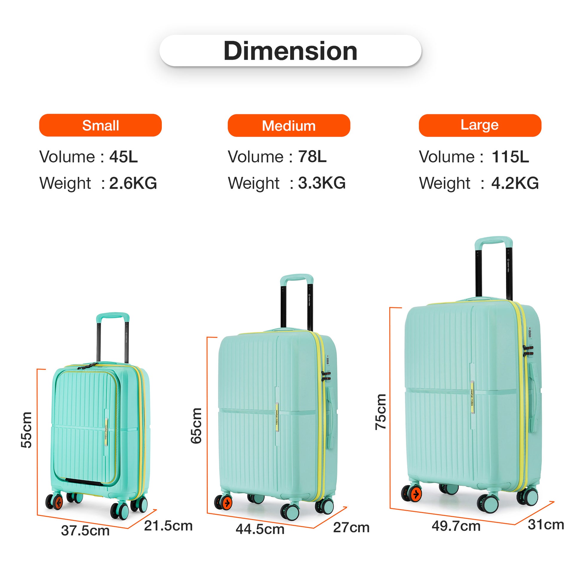 Small (S) Lightweight Hard-Side Cabin Luggage (55/20 inches): Travel with our small cabin-sized luggage crafted from unbreakable polypropylene material, offering long-lasting durability and protection for your belongings. This compact yet durable luggage is designed to carry up to 10-15 kg of weight and can accommodate materials for a short trip of 2-3 days.It comes with a quick access front compartment with multiple pockets for essentials like documents and a laptop, ensuring unmatched convenience.