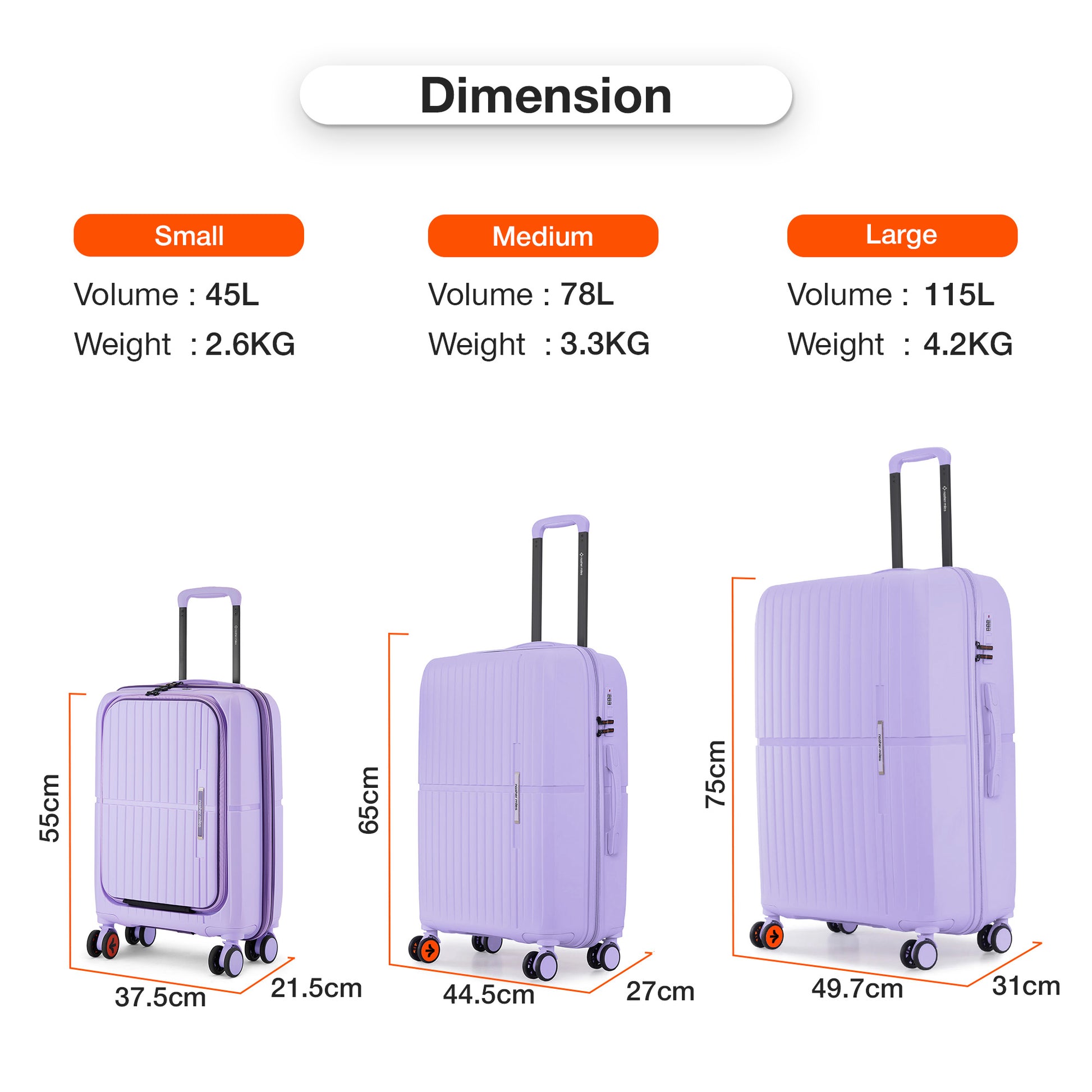 Small (S) Lightweight Hard-Side Cabin Luggage (55/20 inches): Travel with our small cabin-sized luggage crafted from unbreakable polypropylene material, offering long-lasting durability and protection for your belongings. This compact yet durable luggage is designed to carry up to 10-15 kg of weight and can accommodate materials for a short trip of 2-3 days.It comes with a quick access front compartment with multiple pockets for essentials like documents and a laptop, ensuring unmatched convenience.