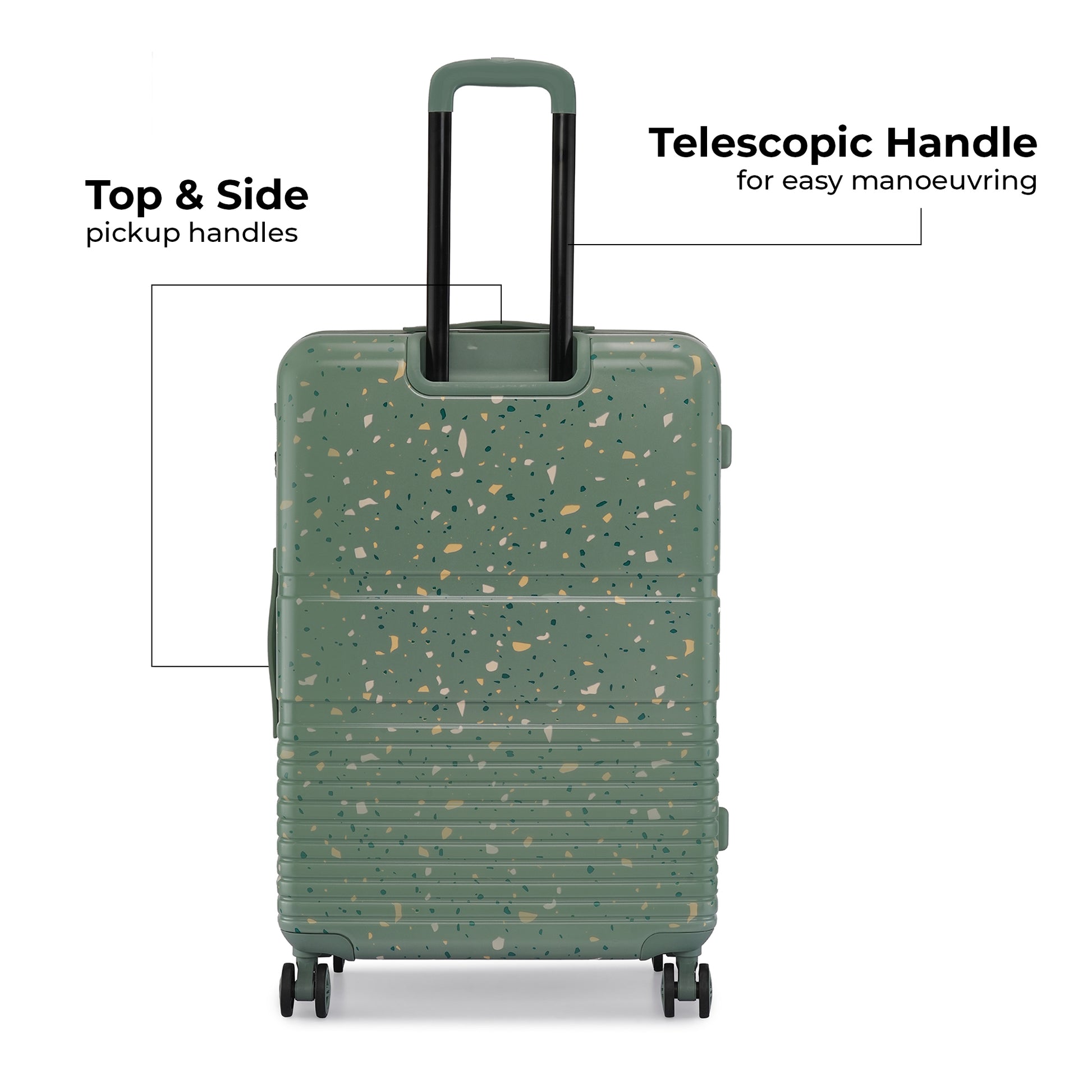 Durable Construction: Crafted with precision using high-grade polycarbonate material for exceptional durability and a lightweight feel. The unique terrazzo print trolley bag safeguards your belongings against bumps, drops, and rough handling at airports or during transit. The telescopic handle is made of aluminum for easy handling.