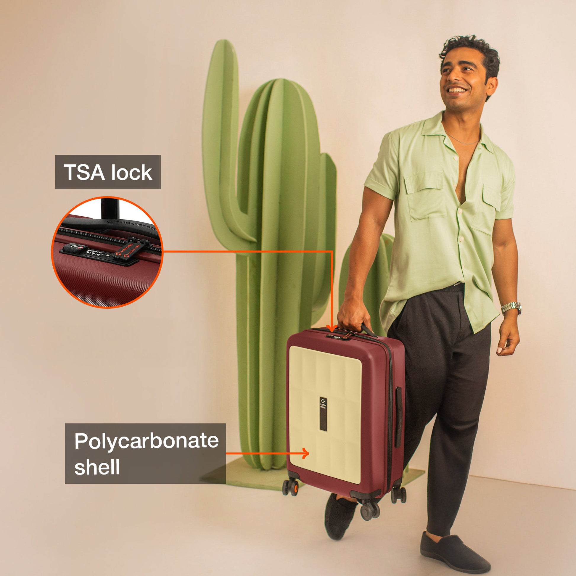 100% Polycarbonate, Scratch & Water-Resistant Luggage: Lightweight and durable, this premium dual colored cabin luggage (55cm /20 inch) features a scratch resistant shell ensuring long lasting durability.