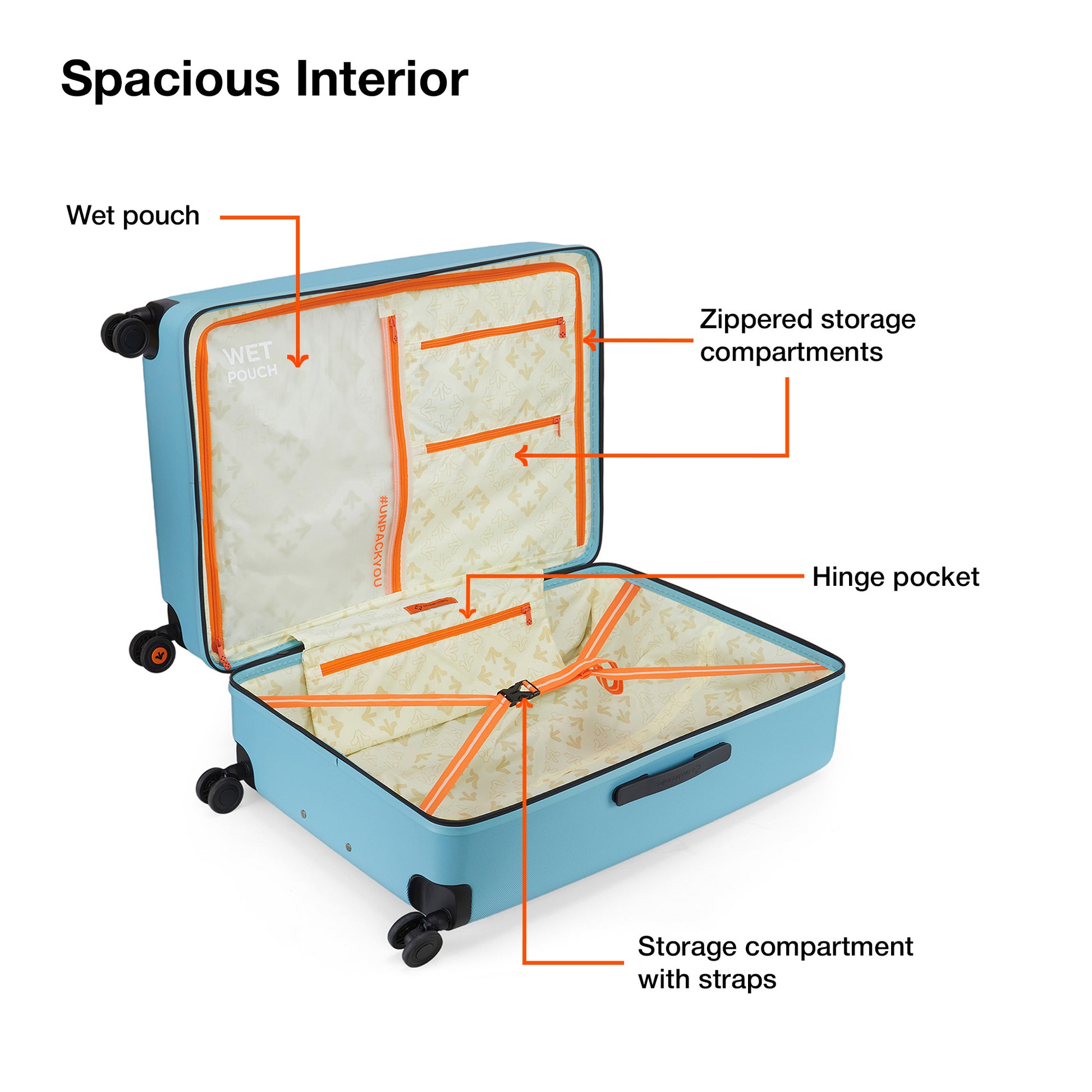 Premium Interior Organization with Wet Pouch: This luggage features two main compartments with a zipped divider , compression straps hinged pocket and a spill-proof wet pouch for toiletries. The check-in (large) luggage can carry weight upto 20kg.