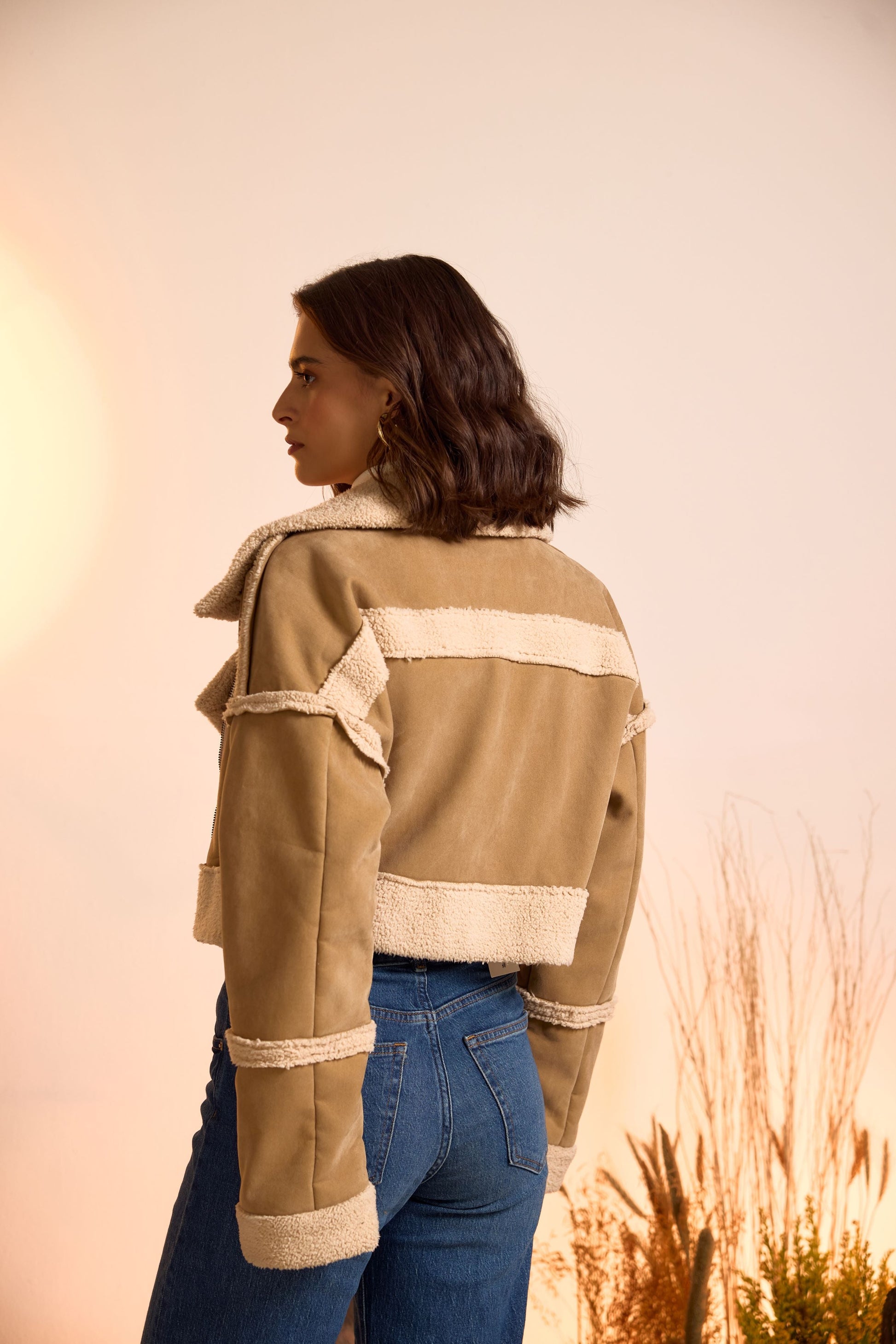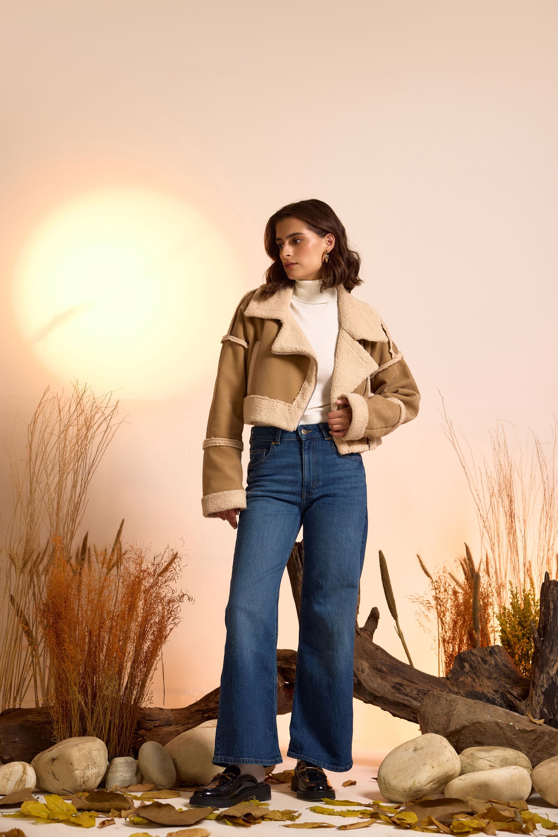 Expertly crafted, this notch lapel cropped shearling jacket boasts a sleek design with a front zipper and convenient side pocket. Perfect for the colder months, its high-quality material provides warmth and style to any outfit.